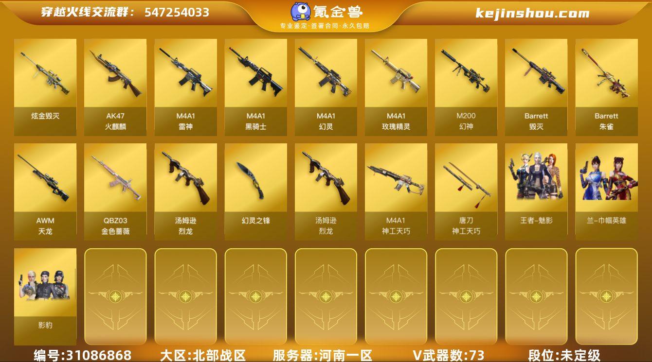 四川一区-32V-3王者武器数-0炫金武器数 【热门武器】:QBZ03-金色蔷薇,M200-幻神,COP-堕天神,沙鹰-修罗 【皮肤】:幻神-丹凤,幻神-宠儿-2021MVP,雷神-荣耀之魄,雷神-虎将,雷神-传奇N9,雷神-宠儿-2019MVP,火麒麟-雷神,AK47-火麒麟-传奇EVEN,火麒麟-平天大圣,毁灭-BEAN-2020MVP,黑骑士-暗月*2,修罗-冠军之魂 【角色】:零·纪元,奇洋探员,乔伊教练,云海玲珑,暗夜-X,初恋灵狐,娟娟,兰-新年限定,灵狐者-X,灵狐者-黄金海岸,潘多拉-甜心教官,青霞仙子,莎莎,斯沃特-X 【人偶武器】:斯泰尔-枪娘暗刃,夺魂 【暴走生化】:超级对讲机 【挑战大师】:冰龙粉碎者-白马银枪,激光毁灭者III-白马银枪,VEPR-12-金魔,激光毁灭者III 【英雄级武器】:AK47-火麒麟,M4A1-雷神*2,QBZ03-金色蔷薇,烈火-动感闪耀,王者芳薇-觉醒版,机械迷城-穹宇,Barrett-毁灭,M200-幻神,王者星神-觉醒版,炼狱-悦蓝-觉醒版,烈龙-云海游龙,沙鹰-修罗,COP-堕天神,天神-动感闪耀,屠龙,马来剑-夜魔,屠龙-动感闪耀,擎天-云海游龙,高爆手雷-夜魔*3,手雷-动感闪耀,手雷-云海游龙,闪光弹-夜魔*3,烟雾弹-夜魔*3 【道具】:WE炫彩背包,云山科技背包,云海游龙炫彩背包,全能枪王背包,虎牙炫彩背包,哔哩哔哩名片,女皇终结者-魔龙之吻,救世主-黑桃战神,绿色巨人,灵魂忍者,迷雾幽灵,夺命之镰,防化服*3,金色流光-枪王排位*2,星辰流光-枪王排位,枪王排位28赛季金色流光,热带奇洋打击特效,动感闪耀表情,云海游龙表情,EP战队名片,防弹头盔*7,防弹衣*7,C4工具钳*7,手雷包*7 【特殊枪械】: