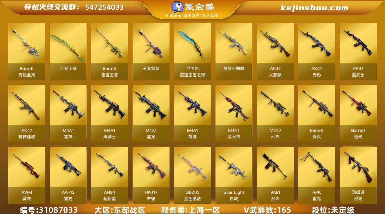 9694/东部/上海一区/可排位/【Lv.102 荣耀元帅】 165V/【两传说】/传说圣灵/传说光耀/【幻神三件套3皮】/幻神/幻神音效卡/幻神N9/幻神荣耀世冠白鲨/幻神降龙/王者幻神/王者星神/M200竞技荣光套/【四神兽】/白虎/白虎电玩粉兔/青龙/朱雀/玄武/【QBZ三件套】/QBZ金色蔷薇/QBZ金色蔷薇音效卡/QBZ荣耀世冠EP/堕天神套/夜魔套/雷霆王者套/COP堕天神/*4/COP雷霆王者/*2/USP雷暴/USP神工天巧/柯尔特电竞装甲/黄金猫猫手套白鲨/七套夜魔手雷/六套堕天神手雷/【生化】/6烈龙/5炼狱/3盘龙/斯太尔蝴蝶/炼狱迷你小刚/异变清道夫/毒蜂/双面神/【完美生化属性四防角色】/王者沙漠玫瑰/【皮肤音效卡】/裁决流光秘银/火麒麟白虎/火麒麟盘古/黑骑士少林/雷神虎将/毁灭音效卡/雷神音效卡/黑骑士音效卡/黑龙音效卡/【4个四防角色】/电竞教官云悠悠/王者葵貂蝉/王者魅影/王者沙漠玫瑰/【其他角色】/凌霄/王者瞳闭月羞花/超能女侍觉/审判者/零/葵/樱/瞳/炫/迷迭香/王者玲珑/修道士/奇洋探员/乔伊教练/卡特琳娜/电竞少女/灵狐者黄金海岸/【玩偶武器】/雷神枪娘蕾安娜/火麒麟绝迹/天龙曼陀罗/Cat刀锋/牛牛AK47/COP白鲨/迷你深渊冰龙/迷你地狱终结者/【挑战】/毁灭征服者超越MAX—3+3/暴君乱世超越MAX—3...