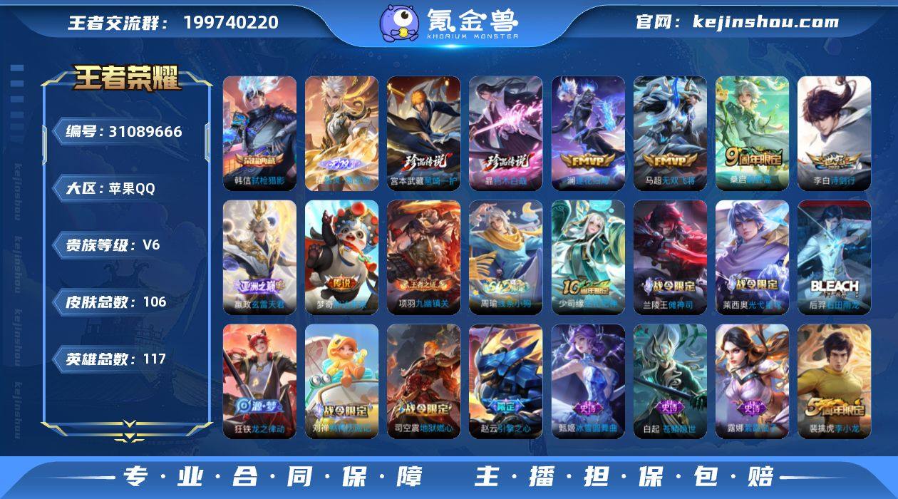 无二次苹果Q-V6-最强王者段位-117英雄-106皮肤-1典藏皮肤-1无双-2珍品传说-7传说-37史诗LK261317 【英雄全皮】:孙权全皮 【荣耀典藏】:韩信弑枪猎影 【无双皮肤】:曜器灵螭龙剑 【珍品传说】:暃朽木白哉,宫本武藏黑崎一护 【传说皮肤】:后羿神树通天,嬴政玄雷天君,桑启鸣野蒿,澜逐花归海,李白诗剑行,马超无双飞将,梦奇胖达荣荣 【限定皮肤】:蔡文姬夏日便利店,虞姬夏日便利店,姜子牙天穹之誓,杨戬破阵退雄兵,狄仁杰阴阳师,赵云皇家上将,赵云引擎之心,孙尚香蔷薇恋人,狄仁杰魔术师,项羽海滩派对,裴擒虎李小龙,鲁班大师探海日志,司空震地狱燃心,阿古朵江河有灵,张良古海寻踪,鬼谷子天穹祈灯,沈梦溪龙舞盛年,周瑜熔金海岸 【赛季限定】:鲁班大师探海日志,张良古海寻踪,鬼谷子天穹祈灯,姜子牙天穹之誓,东皇太一噬灭天穹,太乙真人谧流熔炉,钟馗虚灵犬护,亚瑟荣光之誓,项羽九幽镇关 【战令限定】:司空震地狱燃心,蔡文姬夏日便利店,虞姬夏日便利店,刘禅鸭鸭历险记,沈梦溪鸭鸭历险记,兰陵王傩神司,莱西奥光弋星穹,明世隐往忆晖光,周瑜线条小狗 【史诗皮肤】:露娜紫霞仙子,赵云皇家上将,甄姬冰雪圆舞曲,王昭君偶像歌手,狄仁杰魔术师,宫本武藏鬼剑武藏,孙尚香蔷薇恋人,孙尚香水果甜心,嬴政暗夜贵公子,嬴政摇滚巨星,妲己魅力维加斯,墨子金属风暴,赵云引擎之心,刘邦德古拉伯爵,诸葛亮黄金分割率,安琪拉心灵骇客,百里守约特工魅影,李元芳逐浪之夏,白起星夜王子,阿轲节奏热浪,大乔猫狗日记,狄仁杰鹰眼统帅,小乔青蛇,裴擒虎李小龙,杨戬天秀启明,司空震地狱燃心,阿古朵江河有灵,蔡文姬夏日便利店,马可波罗星界特工,白起苍鳞隐世,刘禅鸭鸭历险记,狂铁龙之律动,后羿石田雨龙,莱西奥光弋星穹,兰陵王傩神司,少司缘巫礼祀神,项羽九幽镇关,周瑜...