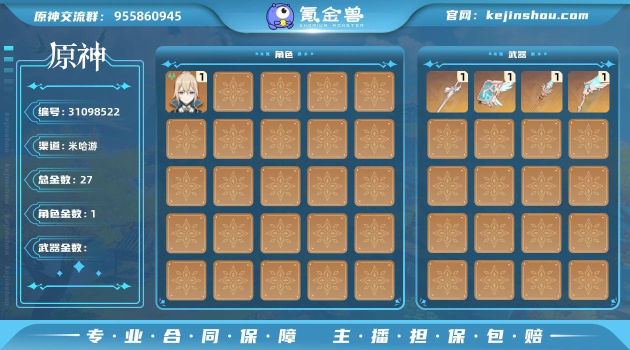 27黄 水元素:6命哥伦比娅 【常驻五星角色及命座】 风元素:1命琴, 0命梦见月瑞希 火元素:0命迪希雅 水元素:0命莫娜 雷元素:6命刻晴 单手剑:精1风鹰剑 长柄武器:精1天空之脊, 精1支离轮光 法器:精1天空之卷, 精3帷间夜曲 弓:精1天空之翼 【角色皮肤】 四星角色:班尼特-炽绘奇旅
