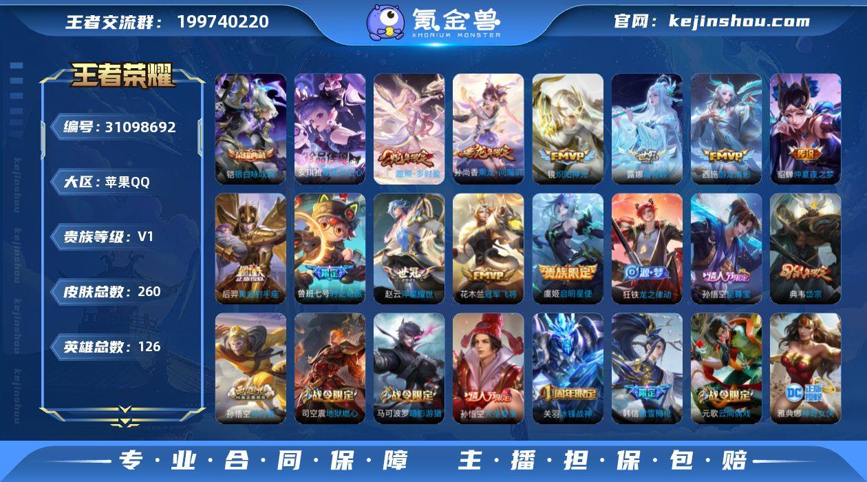 贵族等级:V1 典藏皮肤数:1 珍品无双皮肤数:0 无双皮肤数:0 珍品传说皮肤数:1 传说皮肤数:11 史诗皮肤数:76 皮肤数:260 英雄数:126 段位:铂金 卖家说:11传说1典藏不少限定,两个和平账号 一个安卓一个苹果 皮肤少属于附带