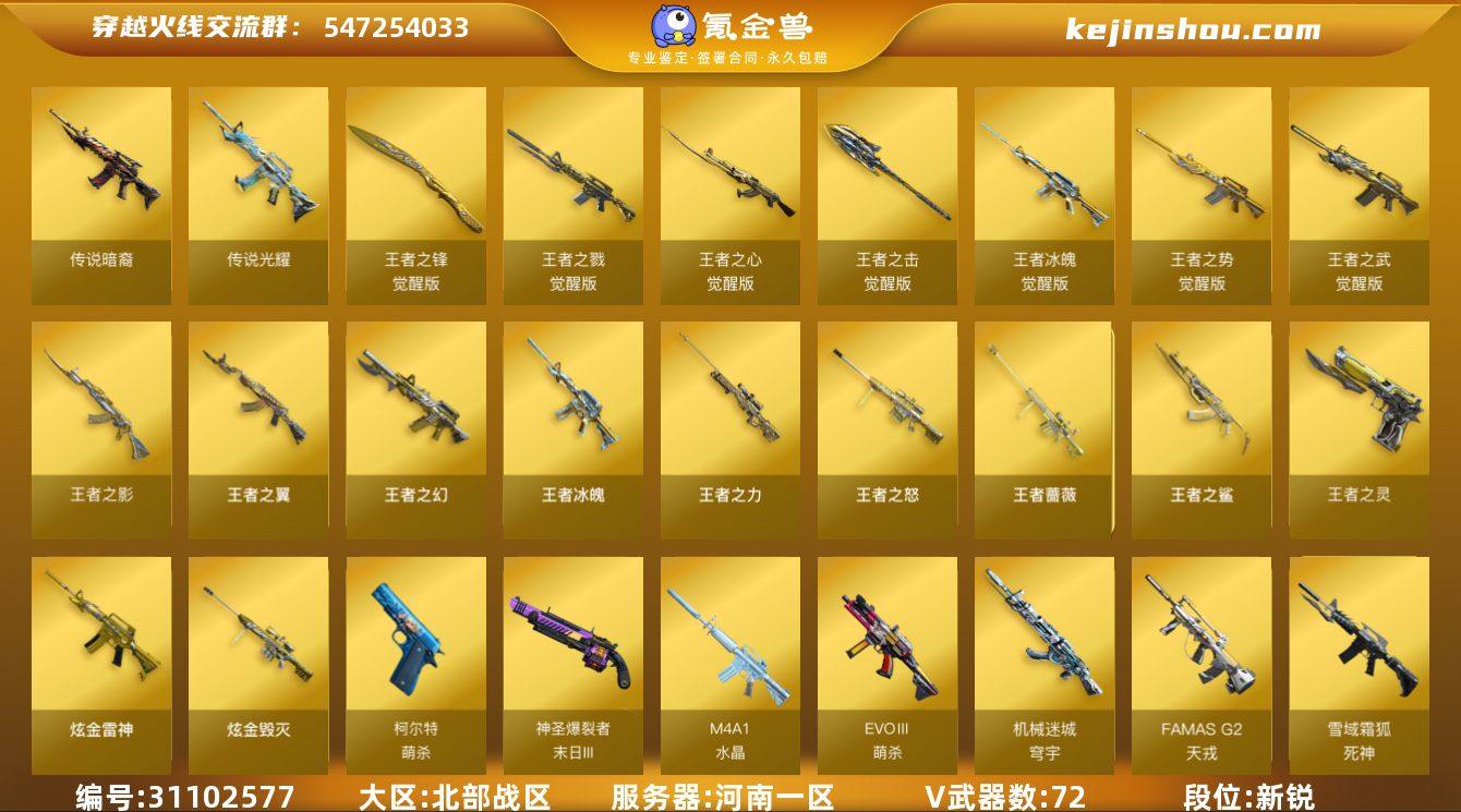 段位:新锐 VIP等级:VIP6 V武器数:72 王者武器数:19 炫金武器数:2 传说暗裔,传说光耀 王者之锋-觉醒版,王者之戮-觉醒版,王者之心-觉醒版,王者之击-觉醒版,王者冰魄-觉醒版,王者之势-觉醒版,王者之武-觉醒版,王者之影,王者之翼,王者之幻,王者冰魄,王者之力,王者之怒,王者蔷薇,王者之鲨,王者之灵 炫金雷神,炫金毁灭 EVOⅢ-萌杀,柯尔特-萌杀,M4A1-水晶,神圣爆裂者-末日III,机械迷城-穹宇,FAMAS G2-天戎,死神-雪域霜狐,M4A1-赤狱骑士,修罗-古蛇迷踪,金色蔷薇-古蛇迷踪,雷霆之锋,无影-神兵利器,AK47-B-身先士卒,尼泊尔-电竞装甲,炼狱-风暴,麒麟刺-堕天神,VSK-94-金蚀,AK47-火麒麟,AK47-雷暴,AK47-黑武士,M4A1-雷神,M4A1-黑骑士,M4A1-死神,M4A1-夜魔,M4A1-猎神,白虎-电玩蓝兔,M200-幻神,Barrett-毁灭,Barrett-电竞装甲,Barrett-朱雀,AWM-天龙,AA-12-雷霆,AK12-天启,HK417-朱雀,QBZ03-金色蔷薇,9A91-烈火,屠龙,麒麟刺,擎天,炽芒蝶刃,柯尔特-竞技荣光,USP-雷暴,擎天-竞技荣光,AK47-B-常胜将军,柯尔特-电竞装甲,斩神刀-雷暴,AK47-B-战士,AK47-B-战神,AK-47-猩红传说,裁决,天神,唐刀神工天巧,破空枪刃-夜魔,龙啸-烈火龙威,烈火-动感闪耀,天神-动感闪耀,屠龙-动感闪耀 王者-零,王者-零-华冠丽服,王者-瞳-闭月羞花,王者樱-热浪之夏 春,兰-海滩派对,零,凌霄,迷迭香,魅影,沙漠玫瑰,铁骑-乘风破浪,樱-缤纷夏日,战地猎狐 死神-雪域霜狐-怀旧音效卡,M4A1-黑骑士音效卡,M4A1-雷神音效卡,AK47-火麒麟音效卡