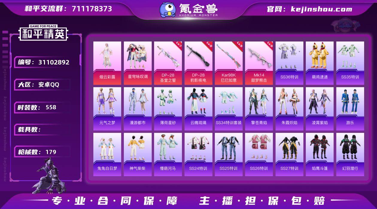 可二次【2粉装4特效枪可秒换绑】 安卓Q区-51529热力值-9印记-144套装-179枪皮 【2粉装】 角色-烟云彩露 星穹咏叹调【4特效枪】 DP-28-圣堂之誓(7级) Mk14-甜梦熊击(5级) DP-28-豹影疾电(5级) Kar98K-巳巳如意(5级)【4热门】 极速红龙 MG3-乌木金纹 M249-妙红点点 M416-糯团青竹 营地ID:782330603