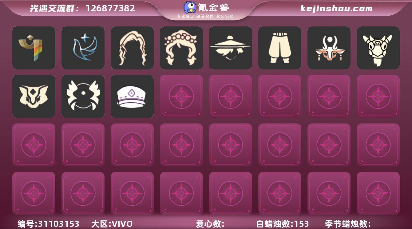 蜡烛数:153/爱心数:9/雨林/彩染季/青鸟季/辉光羚羊面具/青鸟毕业面饰/青鸟斗篷/武士裤/虚荣/花环/若笠/平顶帽/红金斗篷/黄鼠狼/羊头面具/猫猫头/花环长发