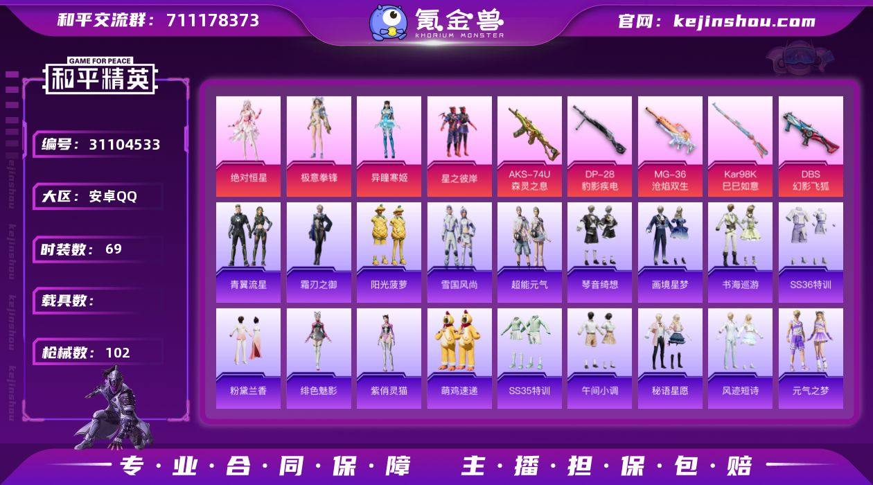 【0载具 5特效枪 4粉装 102枪皮 69套装】3印记/2.8万热力值/有小丑鱼/套装-小丑鱼,套装-星之彼岸,角色-异瞳寒姬,角色-绝对恒星,套装-极意拳锋/5升级枪:Kar98K-巳巳如意,AKS-74U-森灵之息,DBS-幻影飞狐,DP-28-豹影疾电,MG-36-沧焰双生/5飞行器:狂鲨锋刃飞行器,鸡智如我飞行器,炫彩糖果飞行器,异域银装飞行器,登顶巅峰飞行器QB551205/153197482x,编号:LYHNI68