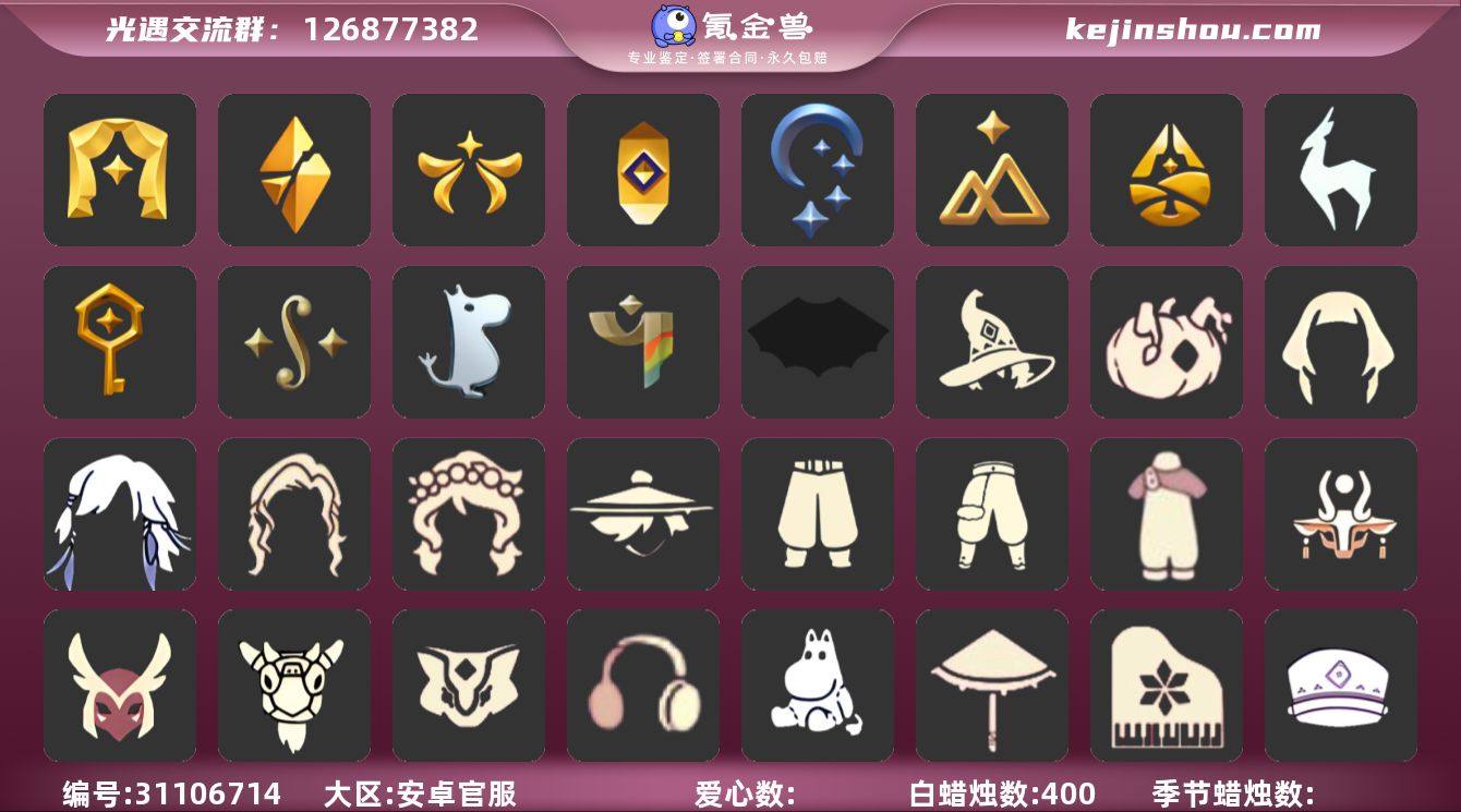 账号类型: 邮箱账号 季节已毕业: 预言季,梦想季,小王子季,风行季,潜海季,表演季,破晓季,欧若拉季,集结季,追忆季 完成地图: 晨岛,云野,雨林,霞谷,暮土,禁阁 珍稀物品: 阿努比斯(狗头),白枭,透明蝶翼斗,玫瑰花 礼包: 蝙蝠套,巫师,围巾,星球斗,绊爱,鹿角,兔子鞋,秋千,茶桌,白绒金,福娃,小船,雪花球,橘子,贝壳,红伞,兔子,南瓜,雪花,水母,新年裤,四叶草,新年耳钉,创始人,姆明饰品套装,献瑞折扇礼包,心心相印发饰礼包,小狗周年发饰,青衫落拓礼包 裤子: 武士裤,背带裤,搓澡巾,击剑裤,王子服,蓝绿裤 面具: 阿努比斯,凤凰面具,贴花面具,呼吸面具,黄眉企鹅面具 面饰: 红耳机 项链: 围巾 发型: 若笠,虚荣,单侧绑发,小王子发型,留辫蘑菇头 头饰: 行军锅头盔,羽毛发饰,平顶帽 斗篷: 海洋斗,蟑螂斗,遥鲲斗篷,黄色连帽披风,燕尾斗篷,冥龙斗篷 配饰: 雨伞,高音钢琴,玫瑰花,圆鼓,鲲灯 亮点: 【优质装备】:预言季,阿努比斯(狗头),表演季,白枭(帝企鹅发),武士裤,梦想季,小王子季(王子季),风行季,潜海季,破晓季,透明蝶翼斗,欧若拉季(欧若拉),行军锅头盔(六边锅帽子)(双耳锅帽子),羽毛发饰(多羽发饰),高音钢琴(白色高脚钢琴),集结季,玫瑰花,追忆季,王子服(小王子套装),蓝绿裤(高领舞服),蟑螂斗(凤凰斗篷),围巾(肩带),蝙蝠套(蝙蝠斗篷)(南瓜头),星球斗(星球夹克),绊爱(绊爱斗篷)(绊爱礼包),红耳机,围巾(小王子斗篷)(小王子围巾),鹿角(圣诞鹿角),巫师(巫师帽),晨岛,云野,雨林,霞谷,墓土(暮土),禁阁,若笠(箬笠),凤凰面具,贴花面具(丛林黑面具),呼吸面具(潜水面具),黄眉企鹅面具,单侧绑发(单边小辫),小王子发型,留辫蘑菇头,遥鲲斗篷(双翼遥鲲斗),黄色连帽披风(连帽斗篷)(斜边队长斗篷),燕尾斗篷,冥龙斗篷,圆鼓(手拍大鼓),鲲灯(追忆之书),福娃(福娃礼包)(春之日礼包)(铜钱斗),秋千(情人秋千),茶桌(花憩茶桌),小船(情人小船),红伞(瑞气纸伞)...