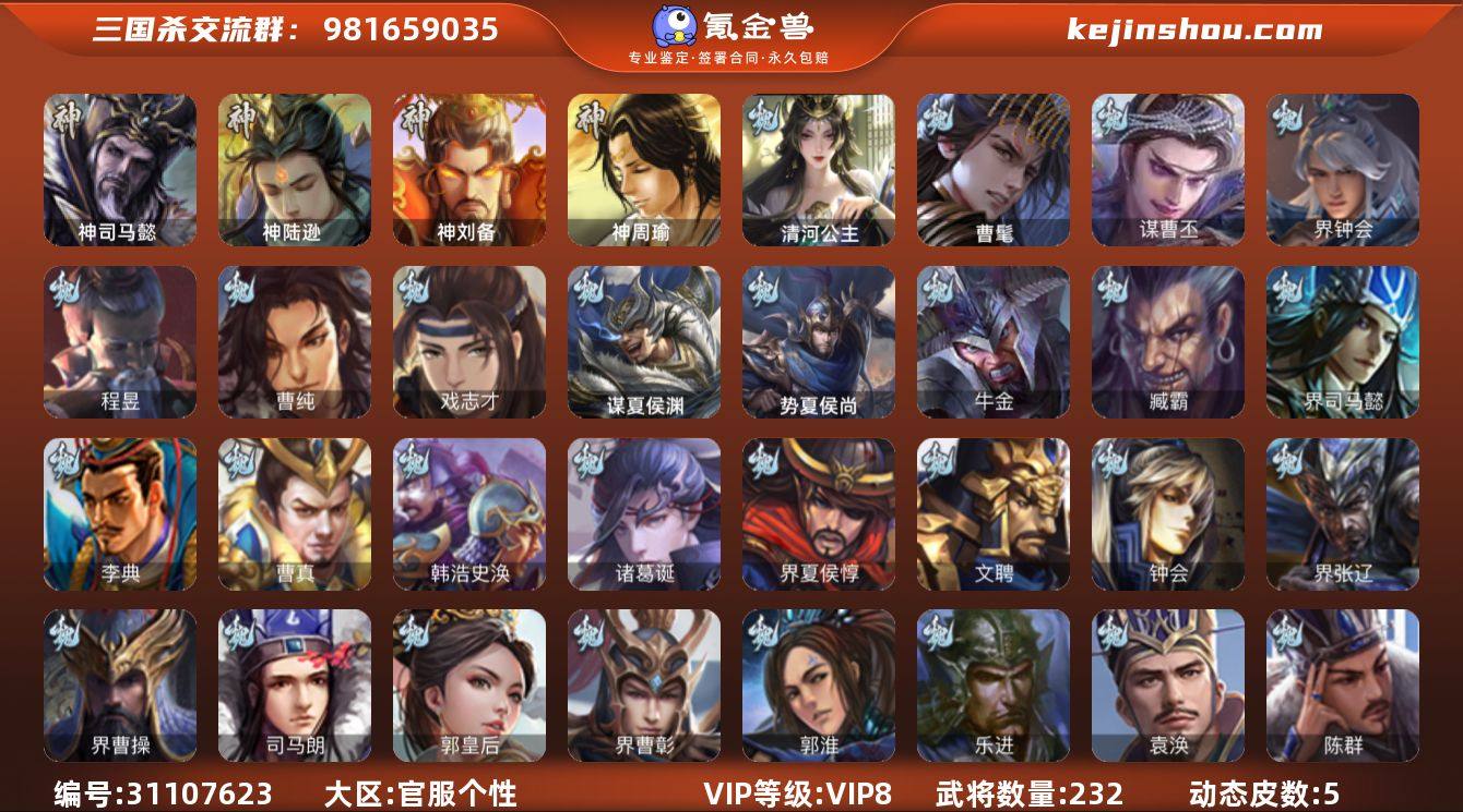 官方个性账号官阶:骠骑将军;VIP等级:VIP8;史诗武将数量:20;动态皮肤数量:5;武将总数:232;史诗宝珠数量:2;将魂数量:635;神将:3;魏国史诗武将:4;蜀国史诗武将:2;吴国史诗武将:2;群史诗武将:6