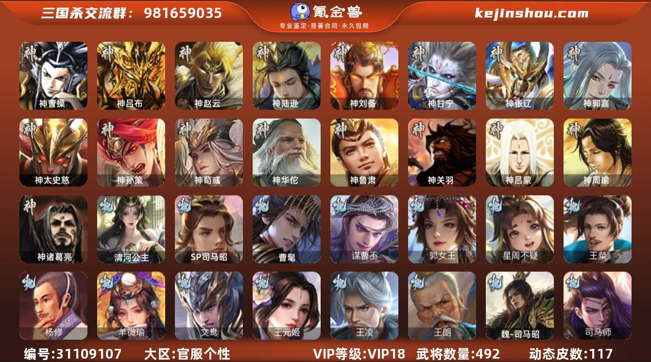 VIP等级: VIP18 官阶: 大将军 武将数量: 492 动态皮肤数量: 117 神将: 神曹操,神甘宁,神郭嘉,神刘备,神陆逊,神吕布,神孙策,神太史慈,神荀彧,神张辽,神赵云,神关羽,神吕蒙,神周瑜,神诸葛亮,神鲁肃,神华佗 魏国武将: 刘晔,戏志才,曹纯,曹婴,陈琳,程昱,郝昭,嵇康,界曹真,界于禁,界钟会,马钧,司马师,魏-司马昭,王朗,王凌,王元姬,文鸯,羊徽瑜,杨修,王粲,唐咨-魏,张辽,SP蔡文姬,SP曹仁,SP关羽,SP贾诩,SP姜维,SP庞德,卞夫人,蔡贞姬,曹昂,曹操,曹冲,曹洪,曹丕,曹仁,曹叡,曹嵩,贾逵,王异,张恭,鲁芝,界满宠,曹休,界曹植,满宠,荀攸,王基,钟繇,蒯越蒯良,郭嘉,荀彧,杜畿,界郭嘉,崔琰,界曹丕,界荀彧,朱灵,界甄姬,辛毗,吕虔,界陈群,界王异,界许褚,界郭淮,华歆,陈群,界邓艾,界典韦,界曹休,谋甄姬,李通,乐进,辛宪英,谋曹仁,郭淮,界曹彰,郭皇后,毌丘俭,夏侯惇,曹植,司马朗,界曹操,星周不疑,许褚,界张辽,谋徐晃,张郃,钟会,文聘,郭女王,曹彰,界夏侯惇,诸葛诞,司马懿,甄姬,杨阜,界徐晃,徐晃,界曹仁,孙资刘放,韩浩史涣,胡班,曹真,谋曹丕,典韦,界夏侯渊,谋荀彧,夏侯渊,李典,于禁,王双,邓艾,界司马懿,张春华,孟达-魏,臧霸,牛金,朱灵(国战),曹髦,成济,清河公主,SP司马昭,董昭,谋夏侯渊 蜀国武将: 鲍三娘,董允,关索,花鬘,界黄忠,谯周,沙摩柯,王平,张星彩,赵襄,周群,诸葛瞻,谋马超,谋赵云,谋夏侯氏,谋黄忠,蜀-谋孙尚香,马云騄,谋黄月英,徐庶,界魏延,杨仪,谋刘备,吕凯,界关羽,界诸葛亮,邓芝,界伊籍,胡金定,费祎,严颜,界黄月英,赵云,张松,彭羕,李丰,界刘备,界刘禅,谋姜维,刘封,糜竺,谋庞统,黄月英,刘巴,关羽,王甫赵累,吴懿,吴班,界吴懿,界廖化,向宠,祝融,张飞,黄皓,陈震,魏延,界周仓,马忠,界法正,糜夫人,界孟获,刘禅,界赵云,谋诸葛亮,界姜维,张翼,关银屏,界祝融,SP孙尚香,SP徐庶,卧龙诸葛,宗预,周仓,简雍,界关兴张苞,诸葛亮,孙乾,界张飞,界卧龙...