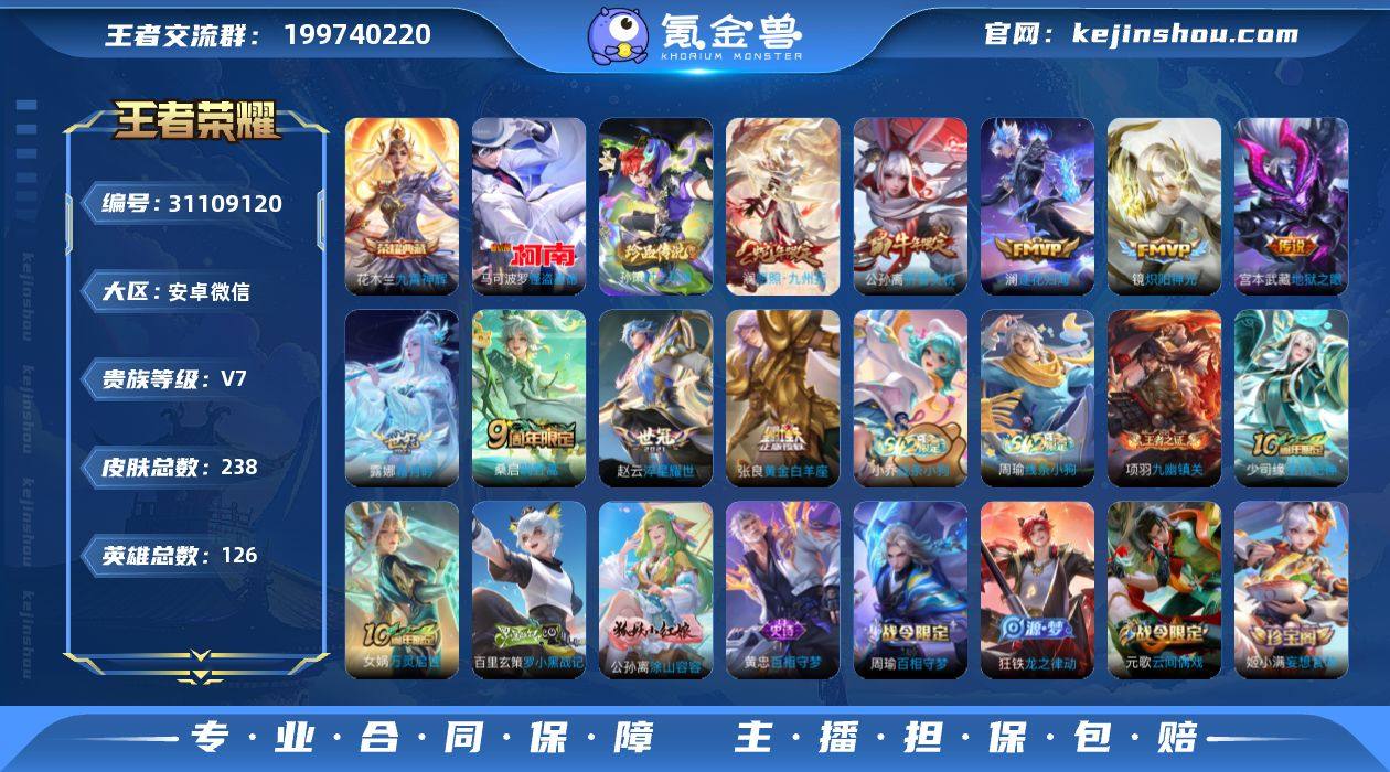 贵族等级:V7 典藏皮肤数:1 珍品无双皮肤数:0 无双皮肤数:0 珍品传说皮肤数:2 传说皮肤数:9 史诗皮肤数:69 皮肤数:238 英雄数:126 段位:王者 卖家说:火影和平无畏契约都连着呢