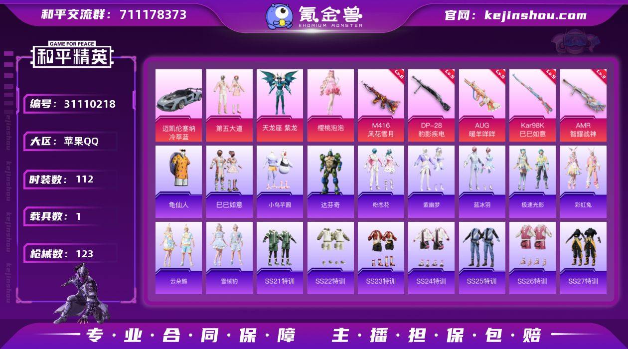编号95849 不可二次 等级55 112套装 123枪皮 5王牌印记 2卓越 热力值37197 1载具 3粉 5特效枪 迈凯伦塞纳(冷萃蓝) 6级M416-风花雪月 满级AUG-暖羊咩咩 3级AMR-智耀战神 满级DP-28-豹影疾电 5级Kar98K-巳巳如意 第五大道 天龙座紫龙 樱桃泡泡 角色-达芬奇 套装-紫幽梦 4粉降落伞