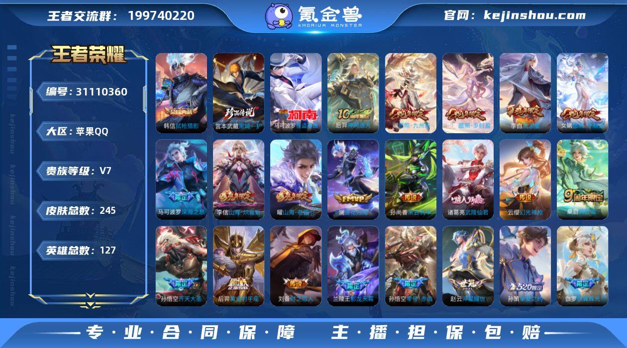 苹果Q-V7-永恒钻石III段位-127英雄-245皮肤-1典藏皮肤-2珍品传说-23传说-79史诗【英雄全皮】:戈娅全皮【荣耀典藏】:韩信弑枪猎影【珍品传说】:马可波罗怪盗基德,宫本武藏黑崎一护【传说皮肤】:后羿神树通天,女娲愿照千秋盛,澜愿照九州拓,虞姬愿照岁时盈,云缨幻光神枪,桑启鸣野蒿,澜逐花归海,兰陵王影龙天霄,伽罗炽翼辉光,孙悟空齐天大圣,曜山海苍雷引,李信山海炽霜斩,马可波罗深海之息,孙策挚爱之约,赵云淬星耀世,虞姬启明星使,孙悟空零号赤焰,刘备时之恋人,梦奇胖达荣荣,后羿黄金射手座,诸葛亮武陵仙君,李白凤求凰,孙尚香末日机甲【限定皮肤】:蒙犽顽岩魄,蔡文姬夏日便利店,虞姬夏日便利店,姜子牙天穹之誓,狄仁杰阴阳师,赵云皇家上将,赵云百木心枪,墨子降魔,嬴政优雅恋人,孙尚香蔷薇恋人,庄周高山流水,扁鹊奇幻香踪,白起夜都怪侠,甄姬女儿国国王,甄姬游园惊梦,马可波罗深海之息,马可波罗山海玄木吟,狄仁杰魔术师,达摩沙漠行僧,项羽海滩派对,韩信飞衡,王昭君午后时光,兰陵王影龙天霄,兰陵王金庭之子,花木兰青春决赛季,孙悟空至尊宝,孙悟空零号赤焰,孙悟空孙行者,孙悟空齐天大圣,后羿圣弓游侠,李元芳匿光侦查者,李元芳云中旅人,虞姬启明星使,杨戬潮玩骑兵,干将莫邪真爱魔法,雅典娜黎明之约,鬼谷子五谷丰年,诸葛亮武陵仙君,苏烈玄武志,苏烈千军破阵,百里玄策原初追逐者,梦奇顽趣,沈梦溪大漠名商,明世隐吟游魔法,裴擒虎擒涛扼浪,狂铁电玩高手,李信山海炽霜斩,伽罗炽翼辉光,孙策挚爱之约,上官婉儿梁祝,嫦娥暖冬兔眠,曜山海苍雷引,西施玲珑珍味,鲁班大师探海日志,镜匿光追影者,桑启海盐诗旅,暃星界游侠,戈娅驭风魔法,艾琳流音漫舞,司空震地狱燃心,阿古朵江河有灵,张良古海寻踪,蒙恬荣光圣徽,鬼谷子天穹祈灯,沈梦溪龙舞盛...
