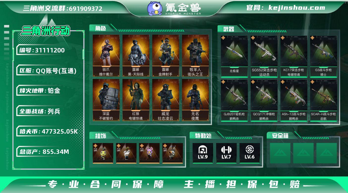 实名:不可二次实名 总资产:855.34M 哈夫币:477325.05K 烽火地带段位:铂金 烽火地带等级:60 全面战场段位:列兵 全面战场等级:38 9级仓库,7级训练中心,6级靶场,1级潜水中心,1级收藏室