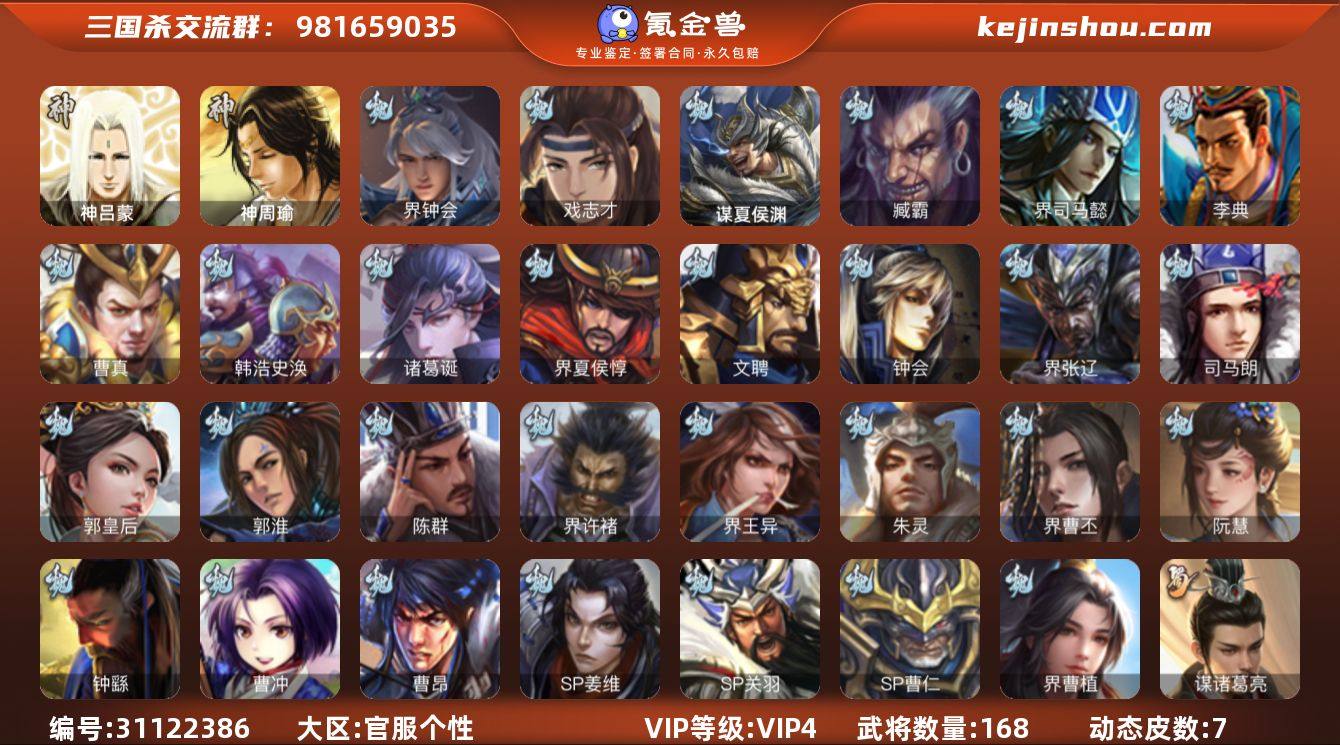 界钟会,戏志才,谋诸葛亮,诸葛瞻,星董卓,神吕蒙,神周瑜,SP关羽,SP曹仁,曹昂,诸葛诞,朱灵,文聘,SP姜维,钟会,曹冲,郭淮,界王异,界司马懿,界夏侯惇,界张辽,界许褚,李典,曹真,韩浩史涣,陈群,钟繇,司马朗,郭皇后,界曹丕,界曹植,阮慧,谋夏侯渊,臧霸,马良,关兴张苞,廖化,关平,刘封,界法正,界关兴张苞,界刘备,界马超,SP徐庶,吴懿,周仓,张松,刘谌,界黄月英,界诸葛亮,严颜,陈震,糜夫人,王甫赵累,彭羕,来敏,凌操,诸葛瑾,孙鲁育,程普,韩当,潘璋马忠,虞翻,朱然,界甘宁,界黄盖,界周瑜,界大乔,界陆逊,孙鲁班,朱桓,顾雍,全琮,孙登,许贡,界韩当,孙邵,界孙休,张布,友庞统,伏完,界袁术,张宝,伏皇后,李儒,华雄,袁术,界华佗,界吕布,公孙瓒,界庞德,界颜良文丑,胡车儿,马元义,谋刘赪,贾充,曹丕-气荡山河(动态),钟会-龙年端午(动态),张昌蒲-龙年端午(动态),夏侯氏-猪年中秋(动态),关索-虎年七夕(动态),徐盛-破军杀将(动态),周处-义除三害(动态)