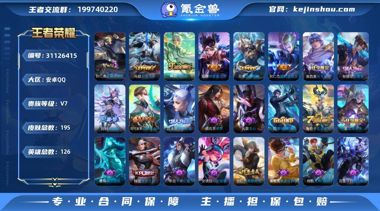 2244941 金标李白 金标达摩 安卓Q-V6-至尊星耀V段位-127英雄-233皮肤-1典藏皮肤-6传说-67史诗 【荣耀典藏】:李白鸣剑曳影 【传说皮肤】:后羿神树通天,桑启鸣野蒿,曜山海苍雷引,马超无双飞将,达摩黄金狮子座,狄仁杰超时空战士 【限定皮肤】:姜子牙天穹之誓,杨戬破阵退雄兵,狄仁杰阴阳师,赵云皇家上将,赵云百木心枪,嬴政优雅恋人,孙尚香蔷薇恋人,庄周高山流水,阿轲迷踪丽影,钟无艳王者之锤,周瑜赤莲之焰,元歌无心,夏侯惇朔风刀,甄姬游园惊梦,狄仁杰魔术师,狄仁杰万华元夜,达摩沙漠行僧,项羽海滩派对,老夫子醍醐杖,安琪拉魔法小厨娘,程咬金演武夺筹,刘邦夺宝奇兵,韩信傲雪梅枪,兰陵王驯魔猎人,兰陵王金庭之子,后羿圣弓游侠,李元芳云中旅人,钟馗驱傩正仪,杨玉环遇见飞天,干将莫邪真爱魔法,鬼谷子原初探秘者,鬼谷子五谷丰年,铠青龙志,苏烈千军破阵,百里玄策原初追逐者,弈星混沌棋,梦奇顽趣,沈梦溪大漠名商,明世隐疑决卦,裴擒虎李小龙,裴擒虎擒涛扼浪,云中君纤云弄巧,上官婉儿梁祝,嫦娥拒霜思,曜山海苍雷引,鲁班大师探海日志,桑启海盐诗旅,艾琳女武神,阿古朵江河有灵,张良古海寻踪,蒙恬荣光圣徽,鬼谷子天穹祈灯,沈梦溪龙舞盛年,刘邦剑破天穹,程咬金群星魔术团,周瑜熔金海岸 【年限皮肤】:铠青龙志,曜山海苍雷引 【赛季限定】:夏侯惇朔风刀,弈星混沌棋,明世隐疑决卦,老夫子醍醐杖,鬼谷子原初探秘者,狄仁杰万华元夜,程咬金演武夺筹,钟馗驱傩正仪,苏烈千军破阵,达摩沙漠行僧,兰陵王金庭之子,沈梦溪大漠名商,李元芳云中旅人,桑启海盐诗旅,裴擒虎擒涛扼浪,鲁班大师探海日志,张良古海寻踪,鬼谷子天穹祈灯,刘邦剑破天穹,姜子牙天穹之誓,东皇太一噬灭天穹,太乙真人谧流熔炉,钟馗虚灵犬护,甄姬逆浪荇歌,亚瑟荣光之誓,百里玄策原初...