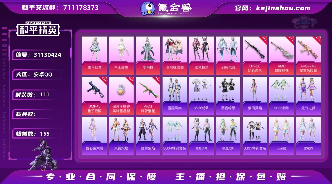 【6粉装6特效枪 秒换绑不用等】 安卓Q区-49157热力值-10印记-111套装-155枪皮 【6粉装】 角色-宁雨蝶 雪月幻音 御兔特攻 星穹咏叹调 幻彩电音 角色-千金淑猫【6特效枪】 AKM-绿萝繁花(5级) AMR-智耀战神(7级) 破片手榴弹-美味星星糖(7级) AKS-74U-星穹咏叹调(5级) DP-28-豹影疾电(5级) UMP45-量子极限(5级)【153热门】 破蛋小黄鸡 团圆交子 瑞龙福将 SS25特训 SS22特训 Mk47-乌木金纹 UZI-娇憨猪猪 UMP45-蓝色火焰 S12K-垂柳戏鸭 MG3-幻世战舞者 AKM-虎虎生威 AKM-霓虹街区 M416-蓝色火焰 GROZA-彩虹符号 长空猛禽 虚音幻奏 甜心亚梦 甜蜜熊情侣 沙漠雄狮 青涩时光 魅力单车 蓝色运动 竞技达人朋克 红色运动 黑色伏地魔 海岛探路者 纯真浪花 粉红小猪 M762-瑞龙福将 M24-樱桃泡泡 Mini14-绯穹魔姬 情公主 平底锅-画境星梦 蜜獾-御兔特攻 顶瓜瓜 冰河战士 SS34特训 幽澜祭司 朱霞炽焰 星渊小夜曲 星影赞美诗 AWM-天降萌叽 SS18特训 SKS-霓虹漫游 大橘大利 风舞幻音 SS16特训 SS17特训 SS19特训 SS20特训 SS21特训 凌霄紫焰 小鸟芋圆 蓝冰羽 龙魂突击队 萝兰蝴蝶 破片手榴弹-爆破雪人 M24-天降萌叽 海盐绵绵冰 M16A4-冰河战士 SS31特训 SS33特训 SS32特训 紫幽梦 极速光影 M762-雏菊兔兔 雪绒豹 Mini14-雏菊兔兔 R1895-雏菊兔兔 SS36特训 热情海星 老实芭蕉 粉恋花 JS9-凌霄紫焰 MG-36-凌霄紫焰 ARX-凌霄紫焰 云朵鹅 Kar98K-星穹咏叹调 短管霰弹-星穹咏叹调 G36C-星穹咏叹调 P92-凌霄紫焰 平底锅-凌霄紫焰 UMP45-海盐豹豹 SLR-金丰海韵 甜心蒙太奇 燃点复合弓-幻海仙踪 Mini14-炫彩节奏 M417-玩趣呆呆 平底锅-瑞龙福将 PKM-紫幽梦 平底锅-飞驰魅影 Mk14-冰河战士 ACE32-画境星梦 M