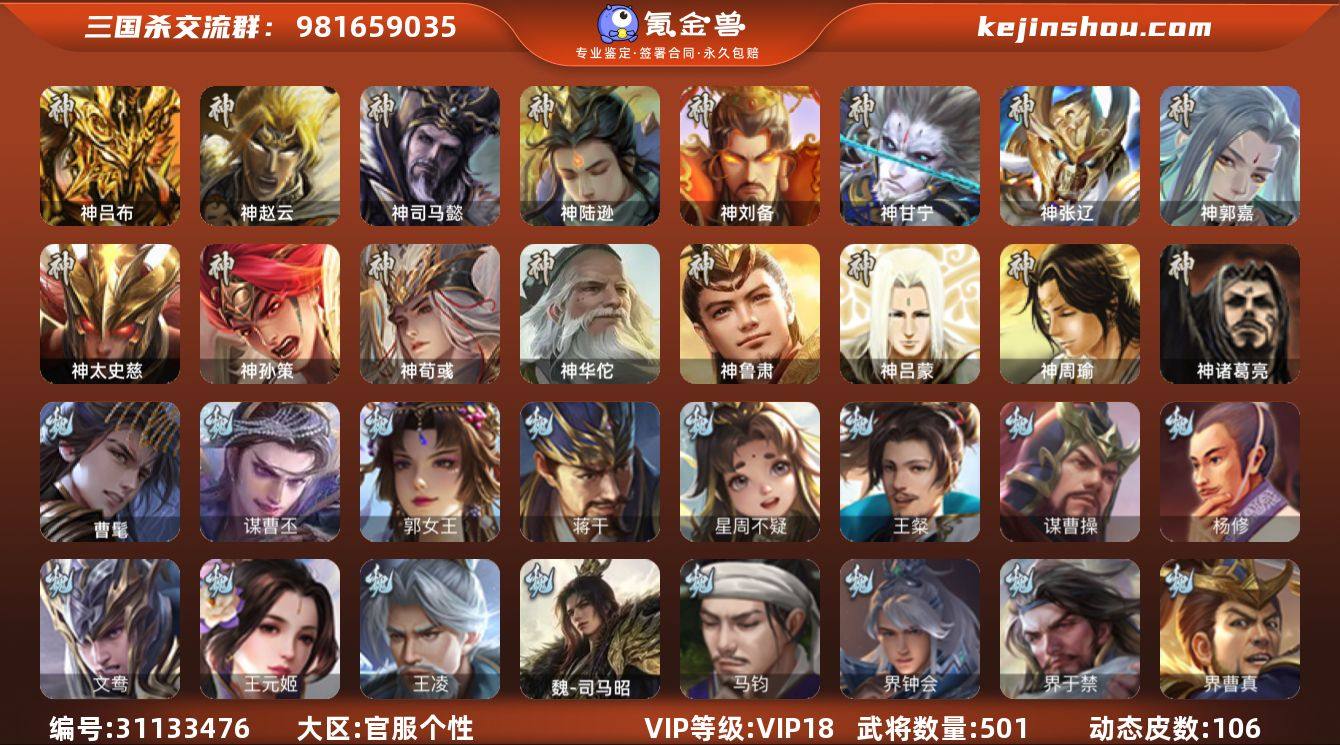 VIP等级: VIP18 官阶: 大将军 武将数量: 501 动态皮肤数量: 106 神将: 神甘宁,神郭嘉,神刘备,神陆逊,神吕布,神司马懿,神孙策,神太史慈,神荀彧,神张辽,神赵云,神吕蒙,神周瑜,神诸葛亮,神鲁肃,神华佗 魏国武将: 刘晔,戏志才,曹纯,曹婴,陈琳,程昱,郝昭,嵇康,界曹真,界于禁,界钟会,马钧,魏-司马昭,王凌,王元姬,文鸯,杨修,谋曹操,王粲,唐咨-魏,张辽,SP蔡文姬,SP曹仁,SP关羽,SP贾诩,SP姜维,SP庞德,卞夫人,蔡贞姬,曹昂,曹操,曹冲,曹洪,曹丕,曹仁,曹叡,曹嵩,贾逵,王异,张恭,鲁芝,界满宠,曹休,界曹植,满宠,荀攸,王基,钟繇,蒯越蒯良,郭嘉,牵招,荀彧,阮慧,杜畿,界郭嘉,崔琰,界曹丕,界荀彧,朱灵,界甄姬,辛毗,吕虔,界陈群,界王异,界许褚,界郭淮,华歆,陈群,界邓艾,界典韦,界曹休,谋甄姬,司马孚,袁涣,李通,乐进,辛宪英,谋曹仁,郭淮,毛玠,界曹彰,郭皇后,毌丘俭,夏侯惇,曹植,司马朗,谋于禁,界曹操,星周不疑,许褚,界张辽,谋徐晃,蒋干,张郃,钟会,文聘,郭女王,曹彰,界夏侯惇,诸葛诞,司马懿,甄姬,杨阜,界徐晃,徐晃,界曹仁,孙资刘放,韩浩史涣,胡班,曹真,谋曹丕,典韦,界夏侯渊,谋荀彧,夏侯渊,李典,于禁,王双,邓艾,界司马懿,张春华,孟达-魏,臧霸,牛金,朱灵(国战),文钦-魏,曹髦,成济,李昭焦伯,司马伷,董昭,谋郭嘉,谋夏侯渊 蜀国武将: 董允,关索,花鬘,界黄忠,谯周,沙摩柯,王平,张星彩,赵襄,周群,诸葛瞻,谋马超,谋赵云,谋黄忠,蜀-谋孙尚香,马云騄,谋黄月英,徐庶,界魏延,杨仪,谋刘备,吕凯,界关羽,界诸葛亮,邓芝,界伊籍,费祎,严颜,界黄月英,界张嶷,赵云,张松,彭羕,李丰,界刘备,谋法正,界刘禅,谋姜维,刘封,糜竺,李遗,谋庞统,黄月英,刘巴,关羽,王甫赵累,吴懿,吴班,界吴懿,界廖化,向宠,祝融,张飞,黄皓,陈震,魏延,界周仓,谋祝融,马忠,界法正,糜夫人,界孟获,刘禅,界赵云,谋诸葛亮,界姜维,张翼,关银屏,界祝融,SP孙尚香,SP徐庶,卧龙诸葛,宗预,周仓,简雍...