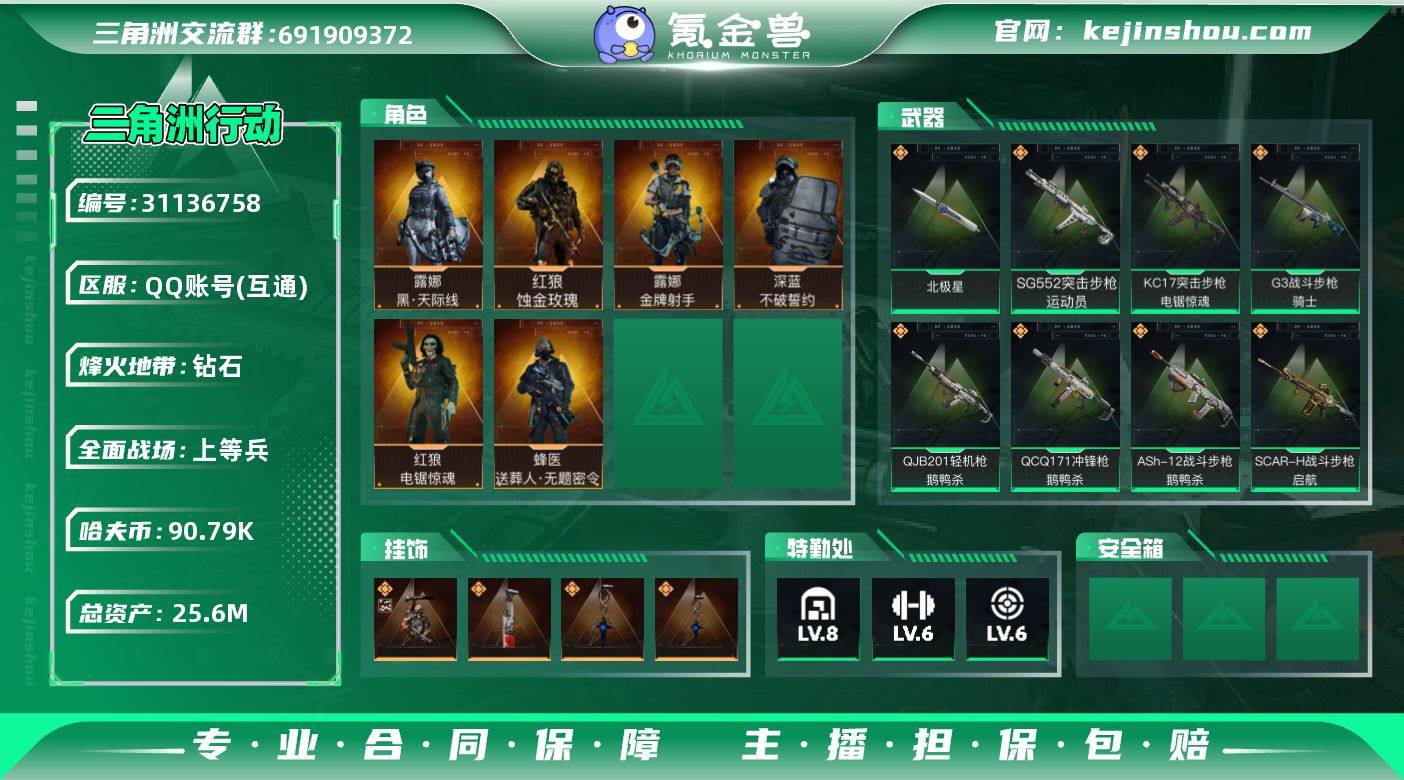 实名:可二次实名 总资产:25.6M 哈夫币:90.79K 烽火地带段位:钻石 烽火地带等级:60 全面战场段位:上等兵 全面战场等级:31 8级仓库,6级训练中心,6级靶场,1级潜水中心,0级收藏室