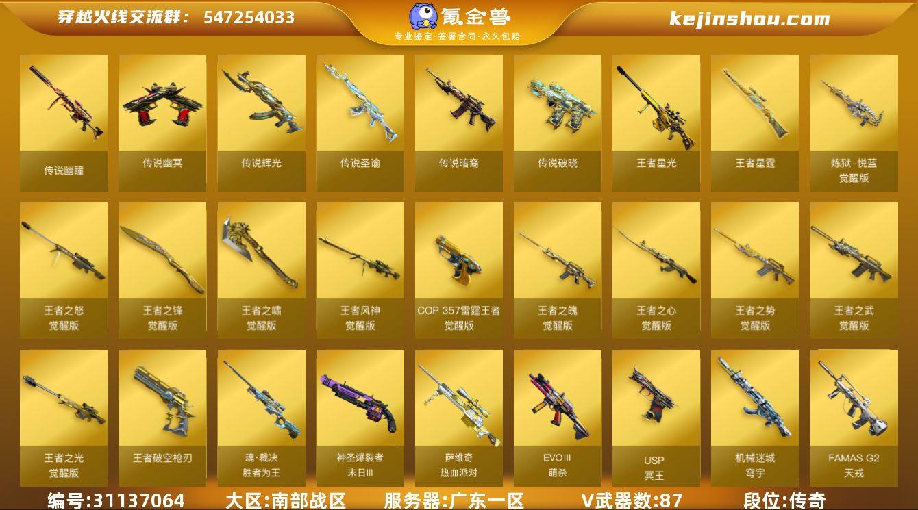 段位:传奇 VIP等级:VIP6 V武器数:87 王者武器数:16 传说暗裔,传说辉光,传说破晓,传说圣谕,传说幽冥,传说幽瞳 王者星光,王者星霆,炼狱-悦蓝-觉醒版,王者之怒-觉醒版,王者之锋-觉醒版,王者之啸-觉醒版,王者风神-觉醒版,COP 357-雷霆王者-觉醒版,王者之魄-觉醒版,王者之心-觉醒版,王者之势-觉醒版,王者之武-觉醒版,王者之光-觉醒版,王者破空枪刃 EVOⅢ-萌杀,魂·裁决-胜者为王,神圣爆裂者-末日III,萨维奇-热血派对,USP-冥王,机械迷城-穹宇,FAMAS G2-天戎,死神-雪域霜狐,M4A1-赤狱骑士,QBZ191-银翼,金色蔷薇-古蛇迷踪,雷霆之锋,无影-神兵利器,AK47-B-身先士卒,尼泊尔-电竞装甲,龙啸-热带奇洋,COP-堕天神,柯尔特-荣耀世冠白鲨2023,八面凌龙,云龙扇,AK47-黑武士-锦绣游龙,VSK-94-金蚀,AK47-火麒麟,AK47-无影,AK47-黑鲨,M4A1-雷神,M4A1-黑骑士,M4A1-死神,M4A1-黑龙,M4A1-猎神,M4A1-玫瑰精灵,M200-幻神,Barrett-毁灭,Barrett-极光,Barrett-朱雀,AWM-天龙,Kar98k-星神,AA-12-雷霆,AK12-天启,AN94-超新星,QBZ03-金色蔷薇,Scar Light-白虎,9A91-烈火,屠龙,龙啸,麒麟刺,擎天,炽芒蝶刃,M200-竞技荣光,柯尔特-竞技荣光,USP-雷暴,擎天-竞技荣光,龙啸-荣耀世冠,AK47-B-常胜将军,AK47-B-战士,AK47-B-战神,AK-47-猩红传说,裁决,柯尔特-冠军之特,USP神工天巧,唐刀神工天巧,破空枪刃-夜魔,G36C-幻影 传说影煞 王者-零,王者-零-传说之路,王者-魅影 妮妮,荆棘,电竞教官-云悠悠,堕落女神,关小雨,华,葵,兰-海滩派对,零,零·纪元,晴雅,枪娘 樱,炫,樱,研,雨墨,战地猎狐 死神-雪域霜狐-怀旧音效卡,天罚音效卡,M200-幻神音效卡,AWM-裁决音效卡,M4A1-黑骑士音效卡,M4A1-黑龙音效卡,Barrett-毁灭音效卡,M4A1-雷神音效卡,AK47-火麒麟音效卡 卖家说:南部广东一区(207V):爆破生化挑战模式质量号/11张音效卡/四防传说影煞/传说幽瞳/传说圣谕/传说暗裔/传说辉光序列号版5432/传说幽冥/传说破晓*2/幻神传说欧欧+星火小队+S24冠军AG+宠儿+星耀+电流骇客+幻神音效卡/星神巅峰荣耀+枪娘默+星神音效卡/王者星霆/竞技荣光套/裁决流光秘银+荣耀巅峰+6运输船+裁决音效卡/极光能量核心/qbz宠儿+破浪逐光+冠军之