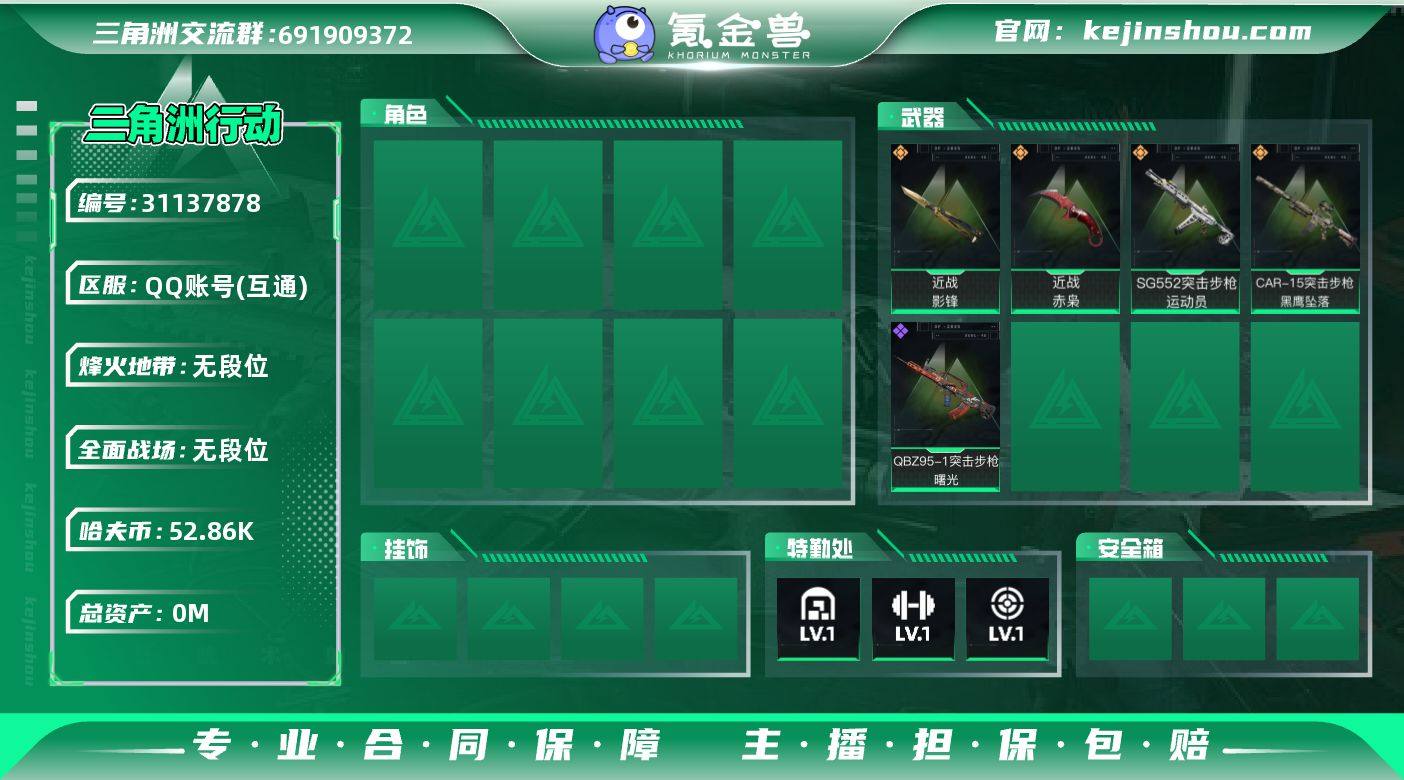 WLSJZ908【新刀 赤枭 黑鹰 影锋 暗星】三端互通-总价值114.6M-哈夫币52861k-烽火地带等级60-烽火地带【近战武器】赤枭 黑鹰 影锋 暗星【枪皮】腾龙突击步枪-古铜 腾龙突击步枪-古铜 AUG突击步枪-天命 M4A1突击步枪-粉色涂装 M4A1突击步枪-高雅黑 M4A1突击步枪-繁盛 QBZ95-1突击步枪-高雅黑 QBZ95-1突击步枪-海浪 QBZ95-1突击步枪-三角洲力量 QBZ95-1突击步枪-2026 QBZ95-1突击步枪-曙光 AKS-74U突击步枪-磐石 ASh-12战斗步枪-繁盛 K416突击步枪-冬日风情 M16A4突击步枪-高雅黑 AUG突击步枪-浅蓝涂装 M7战斗步枪-黑巧甜心 M7战斗步枪-百步穿杨 SG552突击步枪-浅蓝涂装 SG552突击步枪-2026 SG552突击步枪-运动员 AK-12突击步枪-变色龙 SCAR-H战斗步枪-数码迷彩 G3战斗步枪-主宰 G3战斗步枪-流沙送葬 PTR-32突击步枪-黄蜂 CAR-15突击步枪-变色龙 CAR-15突击步枪-狂欢 AS Val突击步枪-百步穿杨 K437突击步枪-磐石 K437突击步枪-生存指令 47突击步枪-暗星 MP5冲锋枪-黄蜂 P90冲锋枪-黑巧甜心 Vector冲锋枪-百步穿杨 UZI冲锋枪-海色 UZI冲锋枪-狂欢 UZI冲锋枪-一帆风顺 SMG-45冲锋枪-行动开启 SMG-45冲锋枪-阿萨拉特攻 SR-3M紧凑突击步枪-变色龙 SR-3M紧凑突击步枪-暗星 勇士冲锋枪-磐石 勇士冲锋枪-主宰 勇士冲锋枪-冰天雪地 QCQ171冲锋枪-银鹭 M1014霰弹枪-旧工业 M1014霰弹枪-变色龙 M249轻机枪-古铜 M249轻机枪-古铜 PKM通用机枪-变色龙 M249轻机枪-黄蜂 M249轻机枪-冰天雪地 QJB201轻机枪-磐石 VSS射手步枪-噬菌体 VSS射手步枪-噬菌体 Mini-14射手步枪-荣耀列队 VSS射手步枪-狂欢 M14射手步枪-工业狂潮 SKS射手步枪-三角洲力量 SR-25射手步枪-黑巧甜心 SR9射手步枪