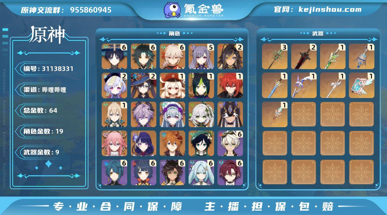 冒险等级:60 总黄数:64 男/女主:女主 5星角色数:19 5星武器数:9 纠缠之源数量:700 原石数量:112 卖家说:风男厨心血号,现生忙没精力继续玩了诚心找个好下家出了,61万叶/63魈/61流浪者均大毕业,带700抽,全图全收集,99%成就全收集