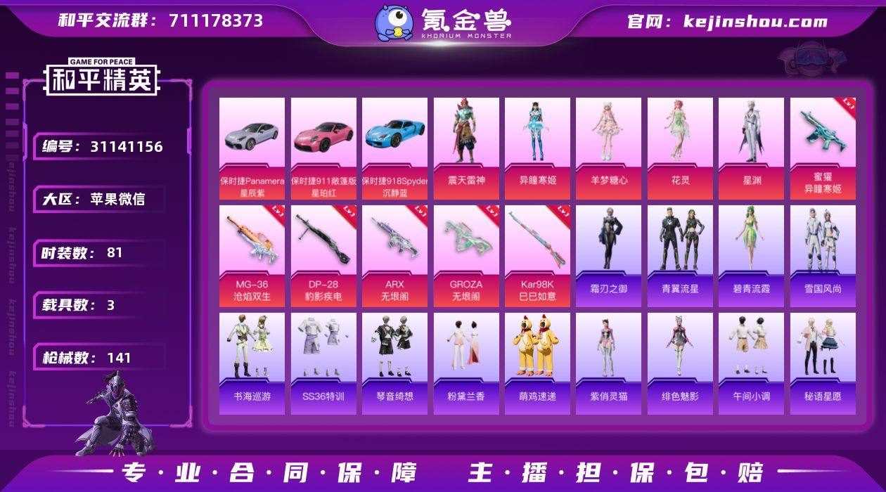 【101】苹果 手Q-11粉装-8特效枪-1载具-4粉色飞行器-73288热力值-8王牌印记-140套装-225枪皮 【热门品类】:套装-龟仙人,套装-浪漫波比 【粉色套装】:粉装-深海曼妙,粉装-未来战士,粉装-天使彩虹糖,粉装-星之信仰,粉装-新星烈龙,粉装-飓风飞鹰,粉装-铁血龙王,粉装-银龙傲海,粉装-彩虹鹿灵,粉装-山涧鹿灵,角色-千金淑猫 【粉色枪皮等级】:AKM-梦之光华(七级),SCAR-L-梦幻火箭(七级),M416-风花雪月(七级),GROZA-镜光银凌(五级),AUG-暖羊咩咩(五级),Kar98K-巳巳如意(五级),DP-28-豹影疾电(五级),平底锅-仲夏莫吉托(七级) 【粉色载具】:阿斯顿马丁DBS(绿) 【粉色枪皮】:AKM-梦之光华,SCAR-L-梦幻火箭,M416-风花雪月,GROZA-镜光银凌,AUG-暖羊咩咩,Kar98K-巳巳如意,DP-28-豹影疾电,平底锅-仲夏莫吉托 【粉色飞行器】:梦幻火箭飞行器,林间仙鹿飞行器 【粉色降落伞】:深海曼妙降落伞,梦幻火箭降落伞,星之信仰降落伞,炫紫旋律降落伞,神秘黑猫降落伞,古堡领主降落伞,四圣焕新降落伞,荧光虫舞降落伞,银刃赛罗降落伞,星之彼岸降落伞,烈焰拳霸降落伞,林间仙鹿降落伞,齐天大圣降落伞,洛神天依降落伞,海渊国主降落伞,暗星紫秘降落伞,彩虹甜喵降落伞,仲夏莫吉托降落伞,炫光之旅降落伞,沙丘之主降落伞,千金淑猫降落伞,炫彩糖果降落伞 【稀有套装】:套装-龟仙人,套装-巳巳如意,套装-雪国风尚,套装-炫彩糖果,套装-糖糖葫芦,套装-青团波波,套装-棉花软糖,套装-燕燕于飞,套装-鱼渊荷华,套装-紫幽梦,套装-蓝冰羽,玩偶服-美羊羊 【稀有枪皮】:AKM-夜灯,AKM-彩虹符号,AKM-恐龙拽拽,AKM-星之信仰,AKM-玉龙,AKM-百万伏特,AKM-虎虎生威,AKM-阿狸红,AKM-霓虹街区,M16A4-幻世战舞者,M16A4-快乐主宰,SCAR-L-怪兽之王,SCAR-L-炫彩节奏,SCAR-L-玉兔迎春,M416-...