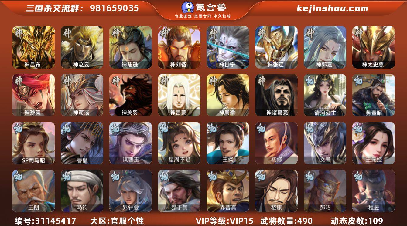 VIP等级: VIP15 官阶: 大将军 武将数量: 490 动态皮肤数量: 109 神将: 神甘宁,神郭嘉,神刘备,神陆逊,神吕布,神孙策,神太史慈,神荀彧,神张辽,神赵云,神关羽,神吕蒙,神周瑜,神诸葛亮 魏国武将: 刘晔,戏志才,曹纯,陈琳,程昱,郝昭,嵇康,界曹真,界于禁,界钟会,马钧,王朗,王元姬,文鸯,杨修,王粲,唐咨-魏,张辽,SP蔡文姬,SP曹仁,SP关羽,SP贾诩,SP姜维,SP庞德,卞夫人,蔡贞姬,曹昂,曹操,曹冲,曹洪,曹丕,曹仁,曹叡,贾逵,王异,张恭,鲁芝,界满宠,曹休,界曹植,满宠,荀攸,王基,钟繇,蒯越蒯良,郭嘉,荀彧,阮慧,杜畿,界郭嘉,崔琰,界曹丕,界荀彧,朱灵,界甄姬,吕虔,界王异,界许褚,界郭淮,华歆,陈群,界邓艾,界典韦,界曹休,谋甄姬,司马孚,袁涣,李通,乐进,辛宪英,郭淮,毛玠,界曹彰,郭皇后,毌丘俭,夏侯惇,曹植,司马朗,谋于禁,界曹操,星周不疑,许褚,界张辽,谋徐晃,张郃,钟会,文聘,曹彰,界夏侯惇,诸葛诞,司马懿,甄姬,杨阜,界徐晃,徐晃,界曹仁,孙资刘放,韩浩史涣,胡班,曹真,谋曹丕,典韦,界夏侯渊,夏侯渊,李典,于禁,王双,邓艾,界司马懿,张春华,孟达-魏,臧霸,牛金,朱灵(国战),曹髦,玄·毌丘俭,清河公主,SP司马昭,董昭,势董昭,谋夏侯渊 蜀国武将: 董允,关索,花鬘,界黄忠,谯周,沙摩柯,王平,张星彩,赵襄,周群,诸葛瞻,谋马超,谋赵云,谋夏侯氏,马云騄,谋黄月英,徐庶,界魏延,杨仪,吕凯,界关羽,界诸葛亮,邓芝,界伊籍,胡金定,费祎,严颜,界黄月英,界张嶷,赵云,张松,彭羕,李丰,界刘备,谋法正,界刘禅,谋姜维,刘封,糜竺,蒋琬,谋庞统,黄月英,刘巴,关羽,王甫赵累,吴懿,吴班,界吴懿,界廖化,向宠,祝融,张飞,黄皓,陈震,魏延,界周仓,谋祝融,马忠,界法正,糜夫人,界孟获,刘禅,界赵云,谋诸葛亮,界姜维,张翼,关银屏,界祝融,SP孙尚香,SP徐庶,卧龙诸葛,宗预,周仓,简雍,谋孟获,界关兴张苞,诸葛亮,孙乾,界张飞,界卧龙诸葛,法正,界简雍,赵统赵广,陈到,界马岱,关平,马岱,界庞...