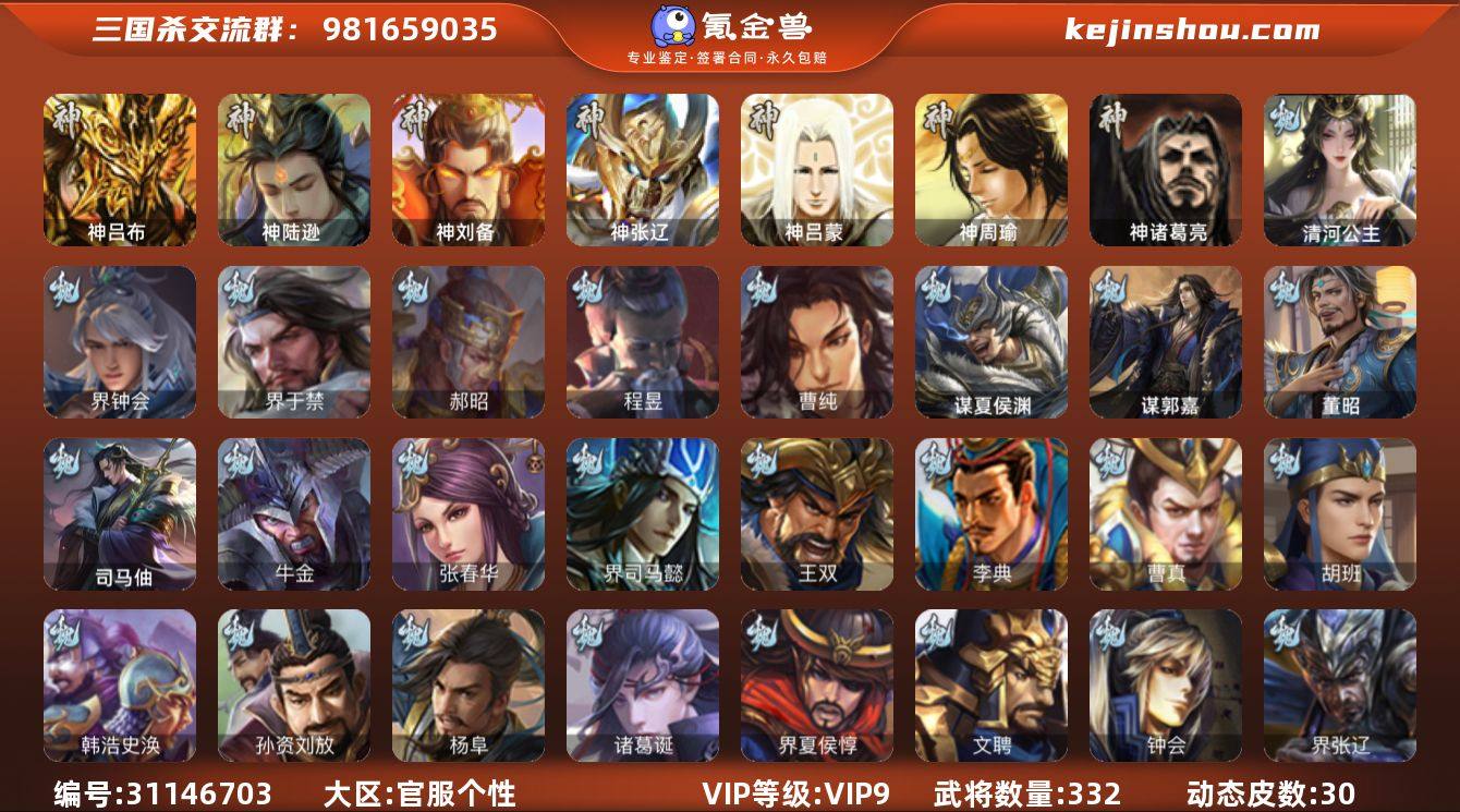 官阶:大将军;VIP等级:VIP9;史诗武将数量:36;动态皮肤数量:30;武将总数:332;史诗宝珠数量:4;将魂数量:6422;神将:5;魏国史诗武将:12;蜀国史诗武将:8;吴国史诗武将:8;群史诗武将:12