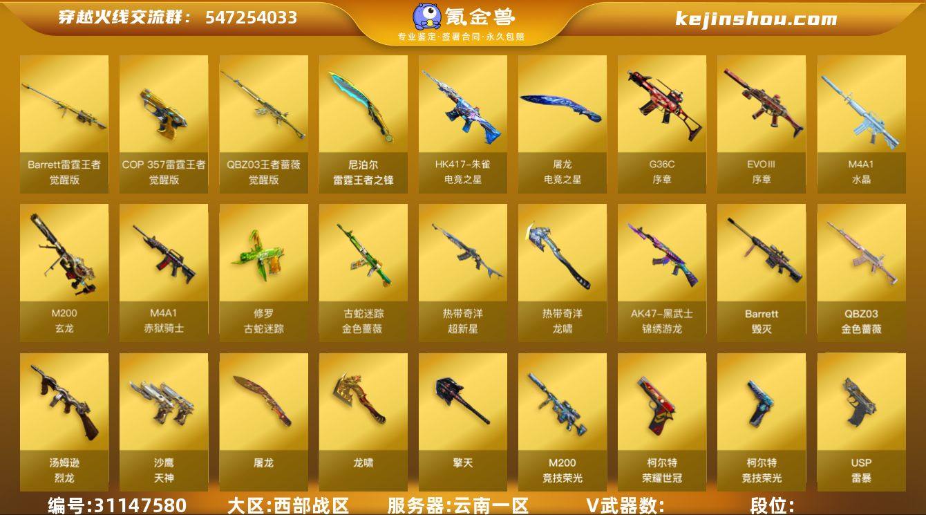 陕西一区-24V-2王者-1炫金 【角色】:灵狐者-职业经理,电竞教官-云悠悠,葵,蜀雪,铁骑荣耀,青霞仙子 【热门武器】:传说圣灵,M200-竞技荣光,荣耀世冠-火麒麟,荣耀世冠-雷神,荣耀世冠-龙啸,USP-雷暴,汤姆逊-烈龙,汤姆逊-烈龙 【王者炫金武器】:炫金修罗 【稀有皮肤】:屠龙-荣耀世冠AG,火麒麟-荣耀世冠AG,黑骑士-摸金校尉,毁灭-风暴,火麒麟-CFSTAR,AWM-天龙-传奇70KG,AWM-天龙-传奇白鲨,AWM-CFS 2020,AWM-CFS 2020,AWM-CFS 2020,M200-庆典-CFS 2021 【其他皮肤】:火麒麟-桃园结义,M4A1-仙界-黑骑士,AK47-齐天大圣,98K-冰雪霸主,98K-烛龙,98K-黑金,修罗-年鹏,M4A1-水枪,巴雷特-绚樱,Scar Light-像素 【人偶武器】:迷你艾比,迷你巨石泰坦-魔花研究所,迷你裂空之翼,迷你裂空之翼,迷你裂空之翼,迷你波特博士,夺魂,迷你生化手雷,迷你生化手雷,生化手雷-机甲核心,生化手雷-机甲核心,深渊终结者手雷 【音效卡】:毁灭音效卡 【挑战大师】:激光毁灭者III-白马银枪,AK47-冰龙粉碎者,冰龙粉碎者-白马银枪 【暴走生化】:超级对讲机 【英雄级武器】:M4A1-雷神,黑武士-锦绣游龙,闪光弹-竞技荣光,闪光弹-竞技荣光,烟雾弹-竞技荣光,烟雾弹-竞技荣光,高爆手雷-竞技荣光,高爆手雷-竞技荣光,汤姆逊-烈龙,汤姆逊-烈龙,AK47-火麒麟,AWM-天龙,Barrett-毁灭,屠龙,M200-竞技荣光,柯尔特-竞技荣光,擎天-竞技荣光,USP-雷暴 【特殊枪械】:0白虎,0黑骑士,2烈龙,0盘龙,0炼狱,0蝴蝶斯泰尔