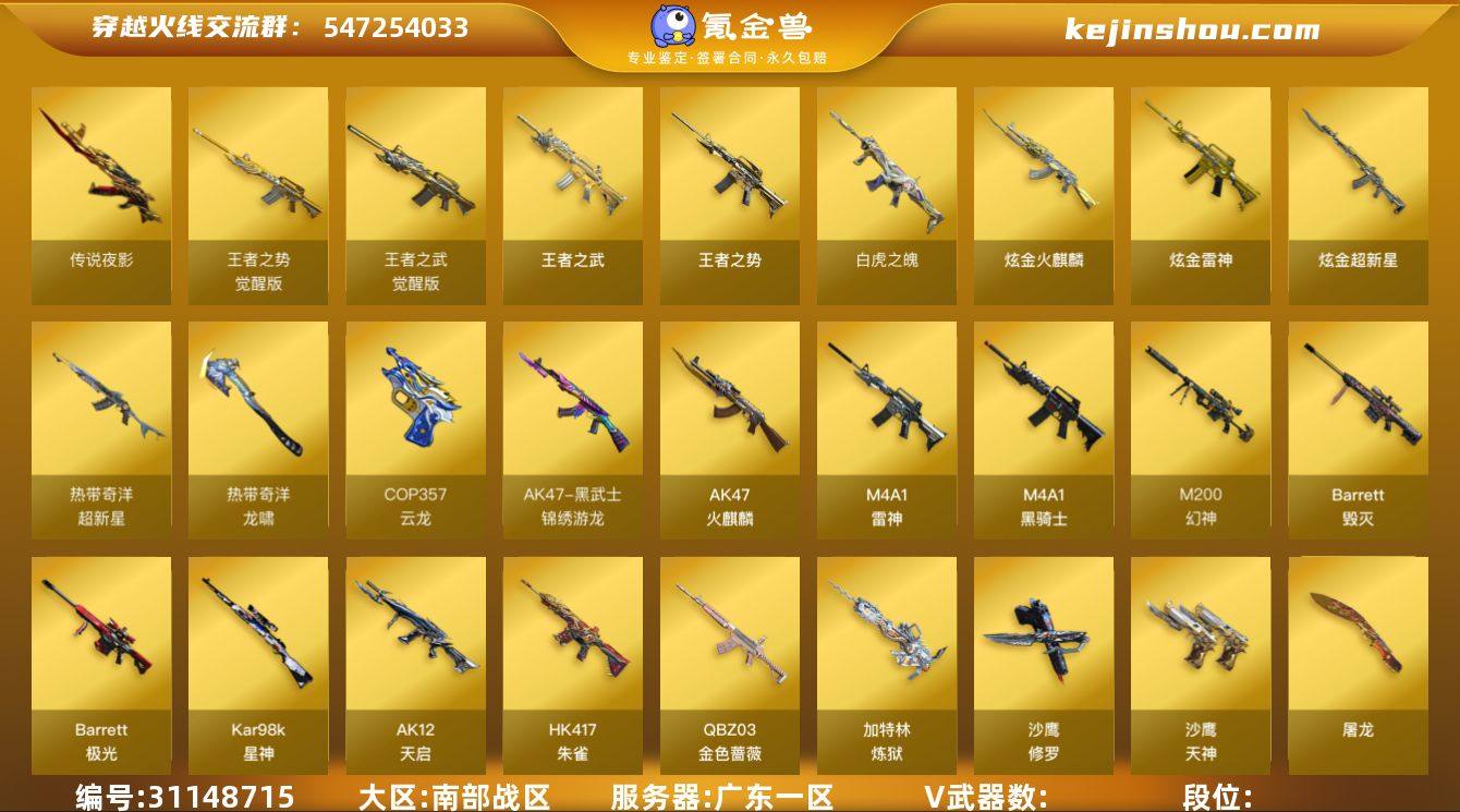 陕西一区-70V-6王者-0炫金 【热门武器】:QBZ03-金色蔷薇,HK417-朱雀,M200-幻神,荣耀世冠-柯尔特,M4A1-黑骑士*2,USP-雷暴,沙鹰-修罗*2 【音效卡】:AK47-火麒麟音效卡,M4A1-雷神音效卡,M4A1-黑骑士音效卡,Barrett-毁灭音效卡,Barrett-碧霄极光音效卡*2,白虎-盛典舞曲音效卡,炼狱-百战金芒-庆典舞曲音效卡 【皮肤】:幻神-丹凤,幻神-青鹤,幻神-KZ-CFPLS25冠军 皮肤,QBZ03-荣耀世冠白鲨,QBZ03-CFS2024 皮肤*2,Kar98K-星神-AG-CFPLS21冠军皮肤,雷神-冠军之魄,雷神-CFS十周年纪念版 皮肤,M4A1-再燃火线,火麒麟-雷神*2,火麒麟-平天大圣,火麒麟-心动糖果,毁灭-CFS2020,黑龙-暗月,屠龙-巅峰荣耀 皮肤,轻型军用手斧-再燃火线,麒麟刺-甜蜜糖果 皮肤 【角色】:零,迷迭香,电竞教官-云悠悠,王者-瞳-闭月羞花,王者-零,王者玲珑,乔伊教练,云海玲珑,初恋灵狐,电竞少女,嘉年华灵狐,娟娟,猎狐者-追月,零-水下丽影,灵狐者-X,麻雀,潘多拉-X,潘多拉-甜心教官,莎莎,斯沃特-X,铁骑荣耀,樱-战斗天使,影武者-X,游珑儿 【人偶武器】:AWM-灵狐-15周年嘉年华,迷你深渊冰龙*2,迷你波特博士,夺魂,深渊终结者手雷,迷你艾比 【暴走生化】:超级对讲机 【挑战大师】:AK47-冰龙粉碎者,冰龙粉碎者-白马银枪,VEPR-12-金魔,激光毁灭者III,神圣爆裂者-末日III 【英雄级武器】:M4A1-千变,AK47-火麒麟*2,M4A1-黑龙,M4A1-雷神*3,M4A1-黑骑士*2,HK417-朱雀,M4A1-夜魔,无影-神兵利器,黑武士-锦绣游龙,QBZ03-金色蔷薇,王者之心-觉醒版,王者之魄-觉醒版,黑骑士-海王,AWM-天龙*3,Barrett-毁灭,Barrett-极光,AWM-裁决,M200-幻神,王者之怒-觉醒版,王者之力-觉醒版,炼狱-百战金芒,AA-12-雷霆,沙鹰-修罗*2,沙鹰-天神,USP-雷暴,荣耀世