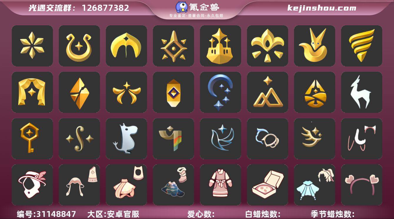 账号类型: 手机账号 季节已毕业: 音韵季,魔法季,圣岛季,预言季,梦想季,小王子季,风行季,潜海季,表演季,破晓季,欧若拉季,集结季,夜行季,追忆季,拾光季,归巢季,九色鹿季,筑巢季,二重奏季,姆明季,彩染季,青鸟季,双星季 完成地图: 晨岛,云野,雨林,霞谷,暮土,禁阁,全图毕业 珍稀物品: 阿努比斯(狗头),白枭,透明蝶翼斗,白鸟头,魔法季耳坠,玫瑰花 礼包: 蝙蝠套,巫师,围巾,星球斗,小狐狸,欧若拉之翼,九色鹿角,莲花斗,音乐桌,大耳狗服饰,绊爱,大铁头,鹿角,荷叶伞,蜘蛛斗,牛仔裤,兔子鞋,肯德基联动,运动鞋,秋千,茶桌,茶壶,餐桌,白绒金,瑞雪,女巫裙,福娃,跷跷板,小船,吉他,灯笼,风之旅人,奔跑裤子,致爱装扮,人声乐器,奔跑发型,鲤鱼套,彩虹帽,雪花球,绒帽,橘子,粽叶,贝壳,黄伞,红伞,兔子,南瓜,枯角,雪花,鲤鱼,竖琴,电吉他,tgc,水母,猫套,猫背饰,星月头饰,彩虹耳钉,彩虹耳机,雪怪斗,球赛门,新年裤,蝴蝶结,魔法棒,奥利奥,海螺,四叶草,暗彩装扮,向日葵套,小提琴,拖鞋,滑板,爱心眼镜,火焰眼镜,伯爵斗篷,透明蛛丝,伯爵面具,飞蛾套,文雀套,雪人鞋,夹袄斗,新年耳钉,龙纹斗,浪漫流星斗,创始人,海蓝波浪发型,飞鸟纸伞,彩虹泡泡机,日光耳环,遥鲲披肩斗篷,满月耳坠,月华套装,锦标赛短袍,锦标赛桂冠,优雅三件套,姆明饰品套装,史力奇套装,史力奇帽子,树精肩饰,恶作剧飞行扫帚,恶作剧鸦羽斗篷,向日葵连衣裙,蛛网朋克,龙鳞束身长袍,仙境茶会门扉礼包,爱丽丝围裙套装礼包,进行曲制服,妮妮斗篷,海龟斗篷,园丁装扮,衔福献瑞礼包,献瑞折扇礼包,渐变双马尾发型礼包,心心相印发饰礼包,小狗周年发饰,篝火点心礼包,奉献斗篷,立式钢琴礼包,宝藏猎人礼包,风之旅人白袍,潮汐套装礼包,粽子发饰礼包,必胜客联动装扮礼包,必胜客联动分享披萨背饰礼包,青衫落拓礼包,周年影院套餐礼包,线框斗篷礼包,缤纷飘带斗篷礼包,小黄鸭雨衣套装礼包,小黄鸭发饰礼包,海牛...