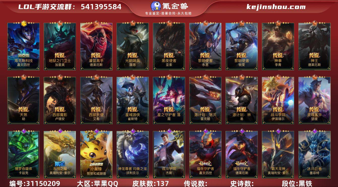 133英雄-137皮肤 【神话皮肤】:海克斯科技 嘉文四世 【传说皮肤】:光明哨兵 薇恩,星域游侠 崔斯特,黑夜使者 亚索,天煞 劫,西部魔影 卢锡安,星之守护者 落 霞,神拳 李青,灵魂莲华 瑟提,黎明使者 永恩,源计划:林 易,灌篮高手 德莱厄斯,神王 德莱厄斯,西部天使 艾希,黎明使者 锐雯,战斗学院 伊泽瑞尔,地狱之门卫士 加里奥,源计划:泯灭 雷克顿 【史诗皮肤】:霸天剑魔 亚托克斯,地狱火 阿木木,小蜜蜂 努努和威朗普,地狱行者 孙悟空,猎梦吞噬者 卡兹克,清剿小队 金克丝,礼物选好了吗? 布隆,灭迹行者 烬,霸天龙神 奥瑞利安·索尔,灰烬领主 奥瑞利安·索尔,东恒之曜 奥瑞利安·索尔,未来战士 潘森,铁血女忍 阿卡丽,源计划:暗影 阿卡丽,泳池派对 菲奥娜,玉剑传说 无双 菲奥娜,未来战士 菲奥娜,银河魔装机神 安妮,福牛守护者 安妮,灵能特工 劫,源计划:雷 卢锡安,我,羽饰骑士 崔丝塔娜,大魔王 提莫,灵魂莲华 提莫,泳池派对 璐璐,驯龙女巫 璐璐,燎原烈焰 蔚,永恒之森 霞,晨星之翎 洛,源代码 卡蜜尔,福牛守护者 嘉文四世,神龙尊者 均衡之龙 沃利贝尔,地下拳王 李青,冰封王子 蒙多医生,西部魔影 德莱厄斯,福牛守护者 德莱厄斯,禁卫机甲 格雷福斯,绝命机甲 格雷福斯,福牛守护者 阿利斯塔,冰川巨兽 墨菲特,暗星 墨菲特,泳池派对 吉格斯,电玩勇者 锐雯,光明哨兵 艾瑞莉娅,冬境仙灵 索拉卡,星域学者 索拉卡,地狱火 加里奥,天启骑士 杰斯,战斗学院 杰斯,猎龙勇士 奥拉夫,泳池派对 凯特琳,欧米伽小队 天雷爆破手 维迦,灵魂莲华 莉莉娅,雷霆领主 奥恩 【赛季皮肤】:s1光耀之刃,s2光耀之芒,s3光耀之灵,s4光耀之心,s6绯金丽刃,s7绯金战斧,s8绯金鮫灵,s9王牌舰长,s10王牌上将,S11王牌勇将,s11王牌司令,s12龙冕先锋,s13龙冕御盾,s15龙冕异士,s1...