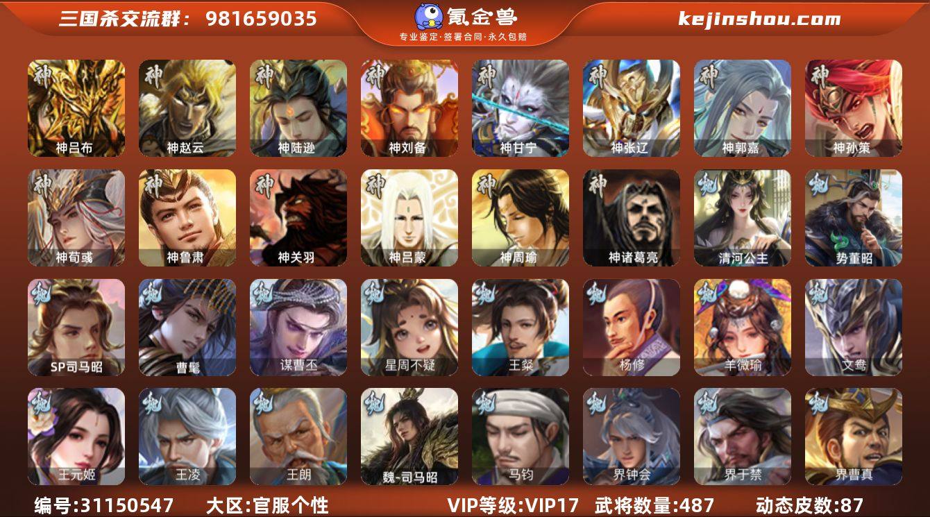 VIP等级: VIP17 官阶: 大将军 武将数量: 487 动态皮肤数量: 87 神将: 神甘宁,神郭嘉,神刘备,神陆逊,神吕布,神孙策,神荀彧,神张辽,神赵云,神关羽,神吕蒙,神周瑜,神诸葛亮,神鲁肃 魏国武将: 刘晔,戏志才,曹纯,曹婴,陈琳,程昱,郝昭,嵇康,界曹真,界于禁,界钟会,马钧,魏-司马昭,王朗,王凌,王元姬,文鸯,羊徽瑜,杨修,王粲,唐咨-魏,张辽,SP蔡文姬,SP曹仁,SP关羽,SP贾诩,SP姜维,SP庞德,卞夫人,蔡贞姬,曹昂,曹操,曹冲,曹洪,曹丕,曹仁,曹叡,贾逵,王异,张恭,鲁芝,界满宠,曹休,界曹植,满宠,荀攸,王基,钟繇,蒯越蒯良,郭嘉,牵招,荀彧,阮慧,杜畿,界郭嘉,崔琰,界曹丕,界荀彧,朱灵,界甄姬,辛毗,吕虔,界陈群,界王异,界许褚,界郭淮,华歆,陈群,界邓艾,界典韦,袁涣,李通,乐进,辛宪英,谋曹仁,郭淮,毛玠,郭皇后,毌丘俭,夏侯惇,曹植,司马朗,谋于禁,界曹操,星周不疑,许褚,界张辽,谋徐晃,张郃,钟会,文聘,曹彰,界夏侯惇,诸葛诞,司马懿,甄姬,界徐晃,徐晃,界曹仁,孙资刘放,韩浩史涣,胡班,曹真,谋曹丕,典韦,界夏侯渊,夏侯渊,李典,于禁,王双,邓艾,界司马懿,张春华,孟达-魏,臧霸,牛金,朱灵(国战),曹髦,清河公主,SP司马昭,司马伷,董昭,势董昭,谋夏侯渊 蜀国武将: 鲍三娘,董允,关索,花鬘,界黄忠,谯周,沙摩柯,王平,张星彩,赵襄,周群,诸葛瞻,谋马超,谋赵云,马云騄,谋黄月英,徐庶,界魏延,杨仪,吕凯,界关羽,界诸葛亮,邓芝,界伊籍,胡金定,费祎,严颜,界黄月英,界张嶷,赵云,张松,彭羕,李丰,界刘备,界刘禅,谋姜维,刘封,糜竺,谋庞统,黄月英,刘巴,关羽,王甫赵累,吴懿,界廖化,祝融,张飞,黄皓,陈震,魏延,界周仓,谋祝融,马忠,界法正,糜夫人,界孟获,刘禅,界赵云,谋诸葛亮,界姜维,张翼,关银屏,界祝融,SP孙尚香,SP徐庶,卧龙诸葛,宗预,周仓,简雍,谋孟获,界关兴张苞,诸葛亮,孙乾,界张飞,界卧龙诸葛,法正,界简雍,赵统赵广,陈到,界马岱,关平,马岱,界庞统,庞统,诸葛果,谋张...