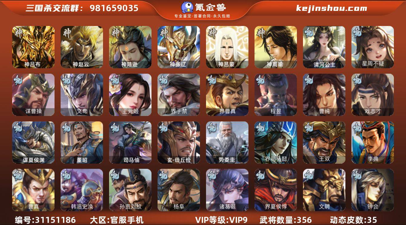 官阶:大将军;VIP等级:VIP9;史诗武将数量:40;动态皮肤数量:35;武将总数:356;史诗宝珠数量:9;将魂数量:6334;神将:4;魏国史诗武将:21;蜀国史诗武将:7;吴国史诗武将:6;群史诗武将:16