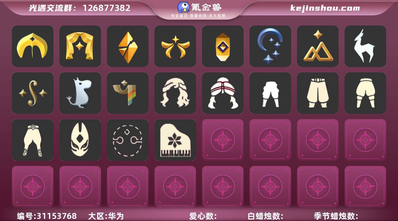 10季10翼妮妮长裙武士裤鲲灯透明蝶翼玫瑰花面具星月头冠潜海面具 资源: 蜡烛 26 爱心18 10翼 已毕业地图:晨岛 云野 雨林 霞谷 墓土 毕业季节: 潜海季 欧若拉季 追忆季 归巢季 九色鹿季 姆明季 彩染季 青鸟季 半二重奏季 半夜行季 稀有礼包:巫师帽 青衫落拓 大桔大利 九色鹿鹿角 星月头冠 小王子斗篷 蛛丝斗篷 狐狸背包 热门裤子:背带裤 遥鲲长袍 绑带舞服 奔月长袍 妮妮长裙 海洋武士裤 白棉裤 搓澡巾 武士裤 女仆围裙 美工衣 红色流珠裙 探险燕尾服 热门面具:矮人面具 狐狸面具 黄鼠狼面具 棕熊面具 盲僧眼罩 向导面具 青鸟面具 红脸蛋面具 玫瑰花面具 玫瑰面具 黑脸 鸟羽面具 热门发型:海藻头 爆炸头 大胡子 小飞象 雨妈 卡卡 平菇 龙骨 箬笠 蝴蝶结 公主头 粗辫 水母头 书虫 总裁头 正太头 高马尾 斗笠 绿丝带 虚荣 圆环发辫 留辫蘑菇头 李逍遥发型 彩色脏辫 彩羽发型 春丽丸子头 樱花 马蹄莲发型 巫师帽 猫猫头 女巫发型 青衫落拓发型 热门头饰: 飞羽发饰 大桔大利 花环 蓝色音乐会 辫子发饰 星月头冠 九色鹿鹿角 探险耳机 热门斗篷:五角星斗篷 红金斗篷 黑金斗篷 白金斗篷 汉服斗篷 围巾(小王子季) 展翼圆环斗 透明蝶翼 小浣熊斗篷 布丁斗篷 布条斗篷 彩霞斗篷 国风斗篷 灰色斗篷 双排扣斗篷 史力奇 斗篷 姆明季斗篷 镂空斗篷 镂空三条斗 彩染季围巾斗篷 红色探险斗 星空斗篷 鸟羽斗篷 新年福娃斗篷 樱花斗篷 马蹄莲斗篷 绿芽 海洋斗篷 彩虹斗篷 暗彩斗篷 蛛丝斗篷 青衫落拓斗篷 热门背饰:号角 相机 红色雨伞 椅子 星星灯 鲲灯 女巫茶桌 狐狸背包 姆明季抱枕 二重奏壁画 mini小手办...