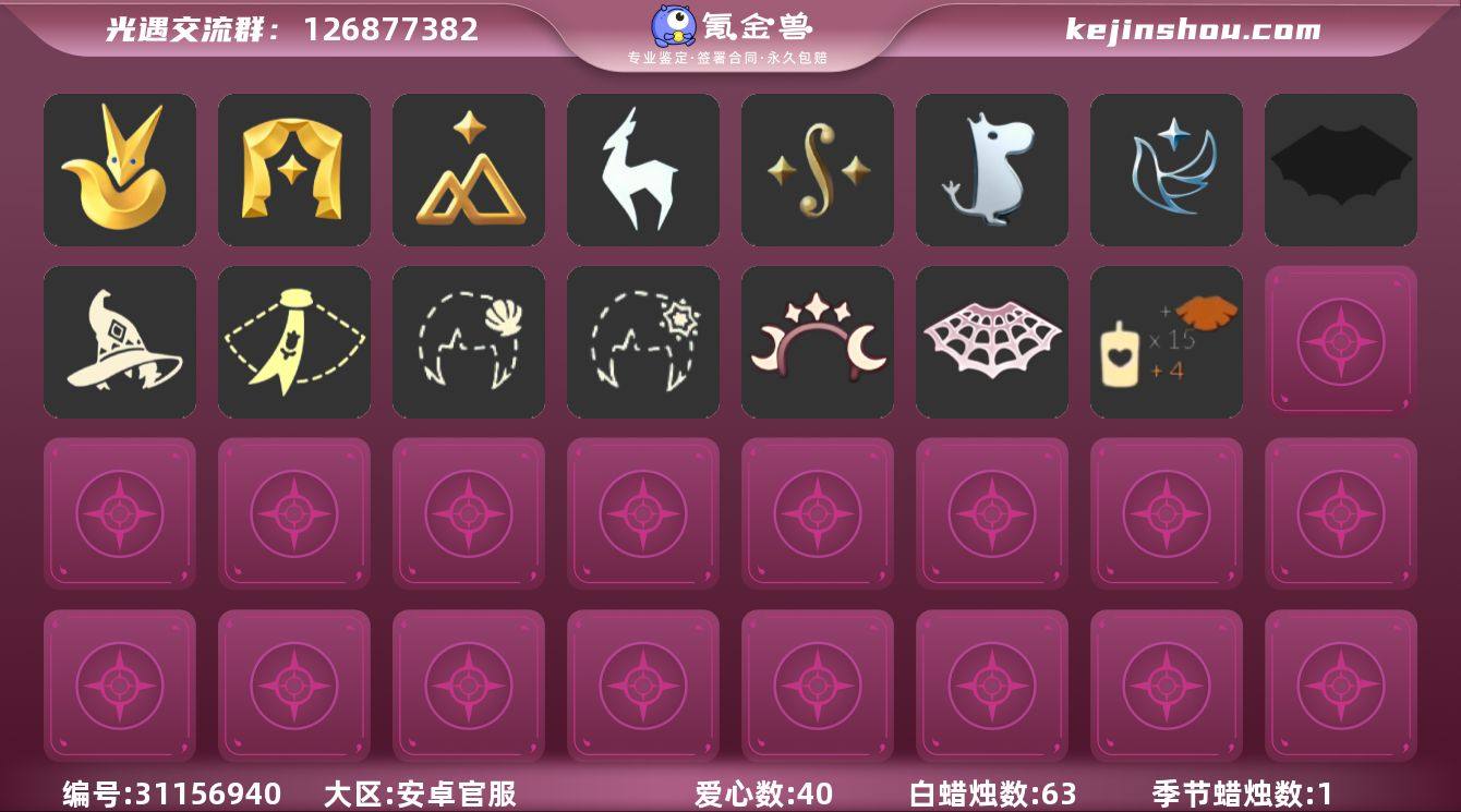 iOS官服 手机账号 4珍稀物品 12毕业季 6毕业图 119蜡烛 【珍稀物品】白枭(帝企鹅发),玫瑰花,透明蝶翼斗,彩虹围巾(五塑彩带斗) 【季节已毕业】梦想季,集结季,小王子季(王子季),风行季,潜海季,表演季,破晓季,欧若拉季(欧若拉),追忆季,夜行季,拾光季,归巢季 【完成地图】晨岛,云野,雨林,霞谷,墓土(暮土),禁阁 【礼包】兔子鞋(兔子拖鞋),绊爱(绊爱斗篷)(绊爱礼包),橘子(大橘大利),兔子(玉兔头饰)(玉兔发饰)(兔子发饰),星月头饰(星月头冠),日光耳环,鹿角(圣诞鹿角),创始人(创始人斗篷),围巾(小王子斗篷)(小王子围巾),蝙蝠套(蝙蝠斗篷)(南瓜头),瑞雪(瑞雪斗篷)(暖冬瑞雪),白绒金(白雪斗篷),茶桌(花憩茶桌) 【裤子】风行毕业裤子(羽袖长袍),王子服(小王子套装),蓝绿裤(高领舞服),武士裤,背带裤,搓澡巾,击剑裤 【面具】黄眉企鹅面具,夜行毕业面具(棕熊面具),呼吸面具(潜水面具),凤凰面具 【面饰】黑框眼镜(粗框眼镜),红耳机 【项链】围巾(肩带) 【发型】小王子发型,单侧绑发(单边小辫),留辫蘑菇头,虚荣,归巢毕业发型(五塑彩羽发),若笠(箬笠) 【头饰】平顶帽,蓝色音乐会(蓝色音乐符),行军锅头盔(六边锅帽子)(双耳锅帽子),牛仔帽(西部帽),羽毛发饰(多羽发饰) 【斗篷】领主红斗篷(暗红斗篷),冥龙斗篷,燕尾斗篷,黄色连帽披风(连帽斗篷)(斜边队长斗篷),遥鲲斗篷(双翼遥鲲斗),粉红绒毛斗篷(绒毛斗篷),瑞雪斗篷,蟑螂斗(凤凰斗篷),绿芽,海洋斗 【配饰】鲲灯(追忆之书),玫瑰花,相机(季卡相机),雨伞,高音钢琴(白色高脚钢琴)