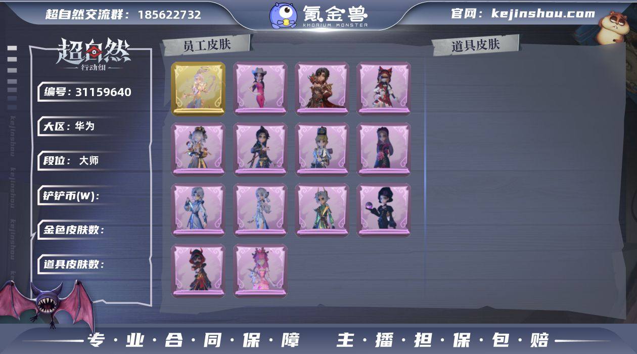 ZR409 商品描述:超自然传说 段位:超自然传说 红色皮肤数量:0 粉色皮肤数量:0 金色皮肤数量:4 紫色皮肤数量:23 道具皮肤数量:42 铲铲币:162480000 铲铲币(单位W):16248 累充:34380金砖 赛季魔盒:稀世豪华魔盒 员工:零 阿念 逍遥 薇薇安 巫铃儿 莉莉 艾伦 爱德华 兰 小满 临云 小黄 爱丽丝 外观:莲华渡 血色中的玛丽 遗失的童话 镜花辞 黎明猎手 庆宴绮愿 耀眼的你 千夜星谕 搬开山 甜梦派对 莓果陷阱 除妖小师妹 赤炼将军 黑月挽歌 青丘一梦 王子与骑士 情公主 冰公主 泽引山海 灵昭鹿鸣 瑞羽衔春 霓裳踏雪 青云逸歌 素影瑶光 丝缕哀歌 绣春逍影 呱呱雨衣 道具:花落精绝 最后的独角兽 金丝眼镜 鸣沙鼓 乘风溯雪 永眠曲 飞花令 青瓷 末章心跳 月下莲台 龙鳞 青玉抱丹 糖葫芦霸王枪 宝剑八 焰骨 蔷薇物语 happy猫 新星时代 敛花容 缚誓之锁 金戈玄铜 星光的裁决 云端梦想计划 赤色之刃 小狗蛇点点鞭 碧络琅环 赞萌波板糖 逆时审判 绯红柴郡猫 幻宠之门 白鼬趴趴 兔先生的时钟 云梦之星 蝶恋花 毛球夹子 在逃小新娘 鼠鼠小跟班 头饰:腊肠扭扭 烛光纪念 太空鲨头套 雪墩墩头套 蒜了八 樱桃奶油布丁 惊魂南瓜头套 鱼头怪头套 烈焰红唇头套 大葱明头套 火爆了头套 面具马头套 哈士奇头套 萨卡班甲鱼头套 嘻嘻头套 滑稽头套 呆滞头套 卑微头套 鳄霸天头套 太美鸡头套 驼半仙头套 小狗蛇点点头套 咬咬鲨头套 炙热烧烤 粽小宝头套 歪嘴蛙头套 像素朋克墨镜 伤心蛙头套 哞哞牛头套 呆呆鸭头套 后室幸存者头套 挂饰:小小玛丽 未竟乐园 小鲨包包 天使消失的年代 钗头凤 糖果守卫 动作:金城舞 sugar摇 知世摇 luvaboy 鸳鸯戏 鹏友摇 心跳摇 伤心摇 小雨摇 蝴蝶步 舞台中心 星奇摇 敲门舞 青海摇 山楂树之舞 带你逃跑吧 律动迪斯科 痞帅进行曲 举牌 晚安公主舞 抬手 旋转舞 KT猫摇 失落 小鸡舞
