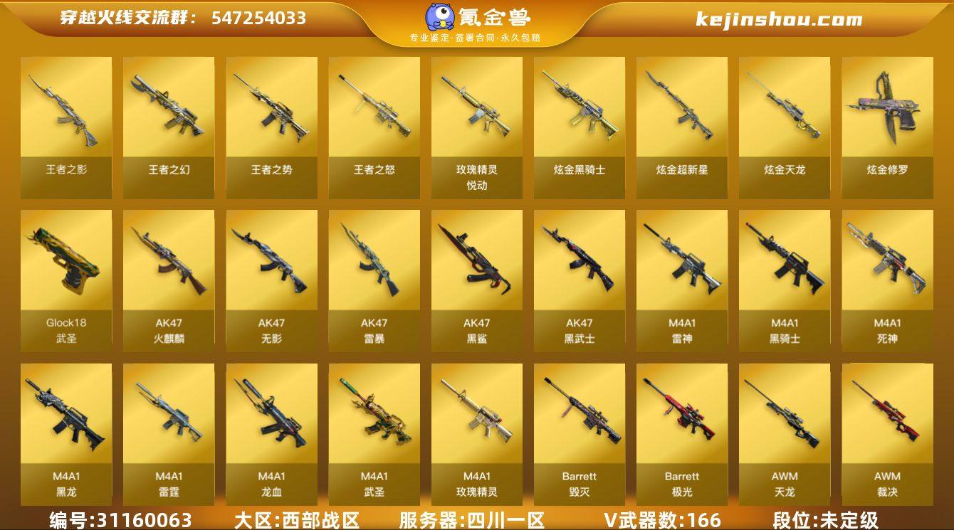 四川一区-172V-15王者-6炫金 【热门武器】:QBZ03-金色蔷薇*4,死亡之眼*5,M4A1-黑骑士*6,汤姆逊-烈龙*8,RPK-盘龙*6,加特林-炼狱*2,斯泰尔-蝴蝶,USP-雷暴,沙鹰-修罗*15 【王者炫金武器】:炫金骑士*2,炫金天龙,炫金修罗*2,炫金超新星,王者之幻*2,王者之势*2,玫瑰精灵-悦动*2,王者之影,王者之怒*2 【音效卡】:M4A1-黑骑士音效卡 【稀有皮肤】:黑骑士-暗月,天龙-能量核心,无影耀金皮肤,天神-暗月*2 【角色】:王者之瞳,零-水下丽影,零,葵,樱,瞳,春,炫,蜀雪,狐影,铁骑荣耀 【人偶武器】:斯泰尔-蝴蝶,M4A1-雷神-精英刀锋,COP-旗袍,迷你生化手雷,闪光弹-小乔 【暴走生化】:斯泰尔-蝴蝶,死亡之眼*5 【英雄级武器】:AK47-雷暴*2,USP-雷暴,斩神刀-雷暴,M4A1-雷霆,M4A1-武圣,Glock18-武圣,QBZ03-金色蔷薇*4,M4A1-雷神*4,M4A1-黑龙*3,M4A1-玫瑰精灵,M4A1-黑骑士*6,M4A1-死神,RPK-盘龙*6,加特林-炼狱*2,汤姆逊-烈龙*8,AK47-无影,AK47-火麒麟,AK47-黑武士*2,AWM-天龙,Barrett-毁灭*9,Barrett-极光,AWM-裁决,M4A1-龙血,AA-12-雷霆*2,AK47-黑鲨*2,AK-47-猩红传说*10,AK47-B-战神,沙鹰-天神*3,沙鹰-修罗*15,麒麟刺*3,擎天,龙啸*3,屠龙*14 【特殊枪械】:蝴蝶斯泰尔+6烈龙,6黑骑士,6烈龙,6盘龙,2炼狱,1蝴蝶斯泰尔