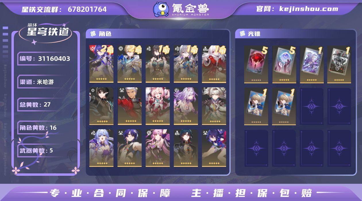 总黄数:27 五星光锥数:5 五星角色数:16 开拓等级:70 开拓者性别:女 星轨专票:4 星琼数量:4175 2命黄泉,2命杰帕德,1命阮·梅,1命布洛妮娅,1命克拉拉,0命丹恒·腾荒,0命Archer,0命风堇,0命遐蝶,0命流萤,0命知更鸟,0命真理医生,0命符玄,0命刃,0命希儿,0命姬子 5精记一位星神的陨落,5精记忆永不落幕,1精让告别,更美一些,1精行于流逝的岸,1精制胜的瞬间 换绑材料:可提供换绑材料 邮箱状态:送普通Q邮 psn绑定情况:否 taptap绑定情况:否 邮箱实名情况:邮箱未实名 卖家说:差十几二十抽大保底 可以当个小号玩玩