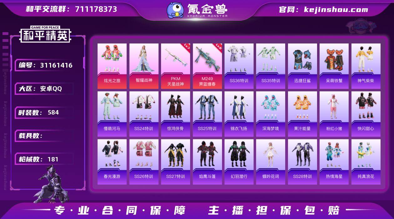 【2粉装2特效枪】 安卓Q区-53270热力值-4印记-148套装-181枪皮 【2粉装】 炫光之旅 角色-智耀战神【2特效枪】 PKM-天星战神(7级) M249-霁蓝缠春(6级)【11热门】 Mark.06 粉红小猪 迅捷狂鲨 极速红龙 醒狮腾龙 团圆交子 MG3-乌木金纹 M249-妙红点点 Kar98K-彩虹符号 M416-糯团青竹 AKM-彩虹符号【2飞行器】 神秘黑猫飞行器 太空嘟嘟飞行器【1背包】 百万伏特背包 营地ID:797290594