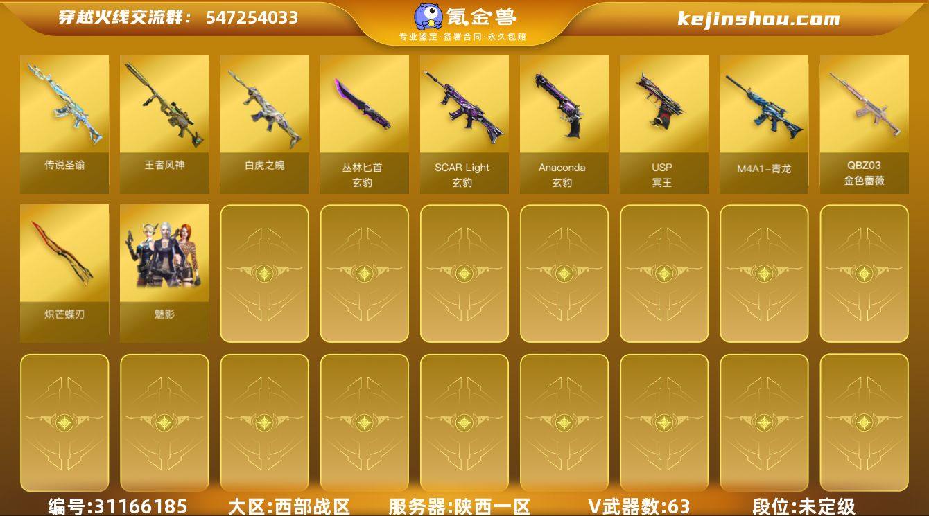 E191216 cf西部/陕西一区/63V/传说圣谕/王者风神/白虎之魄+王者凌虎+青龙/玄豹套/USP冥王*2/QBZ金色蔷薇/炽芒蝶刃/棘刺(四防)/18皮可排