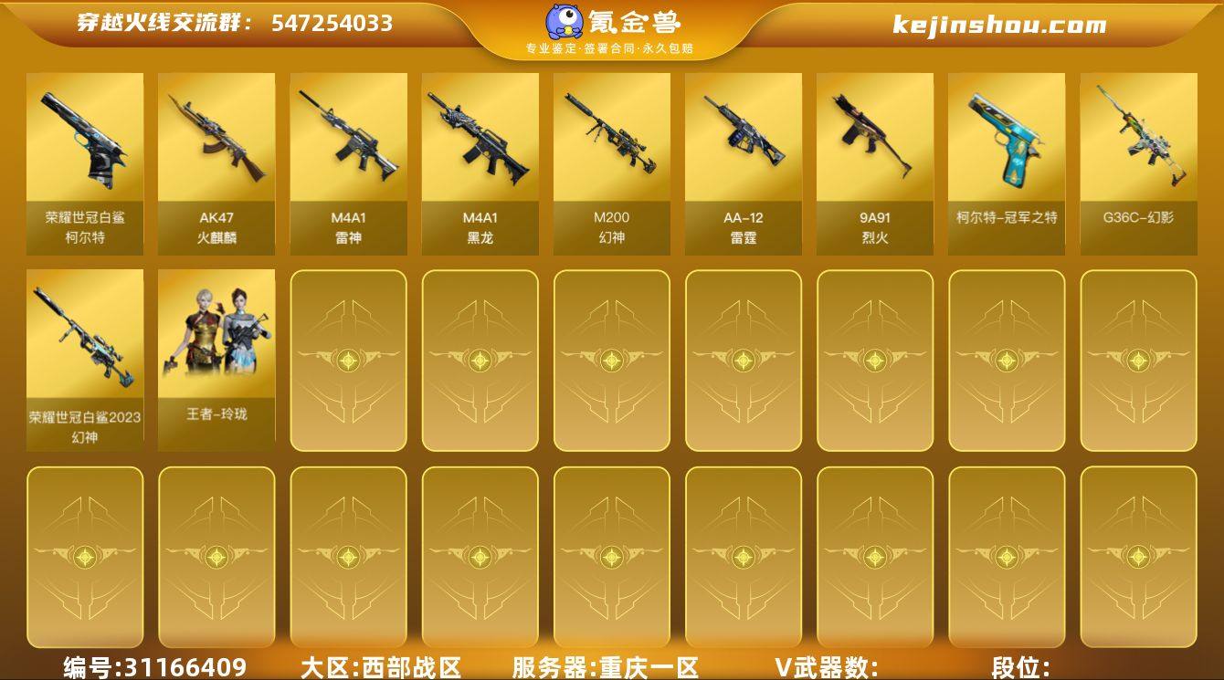 T193008(幻神皮肤+幻影+两把柯尔特)cf西部/重庆一区/17V/幻神+荣耀世冠白鲨2023/g36c幻影/柯尔特荣耀世冠白鲨2023+柯尔特冠军之特/火麒麟/黑龙/雷神/无影/死神/9a91烈火/炼狱/aa12雷霆/王者玲珑/7皮