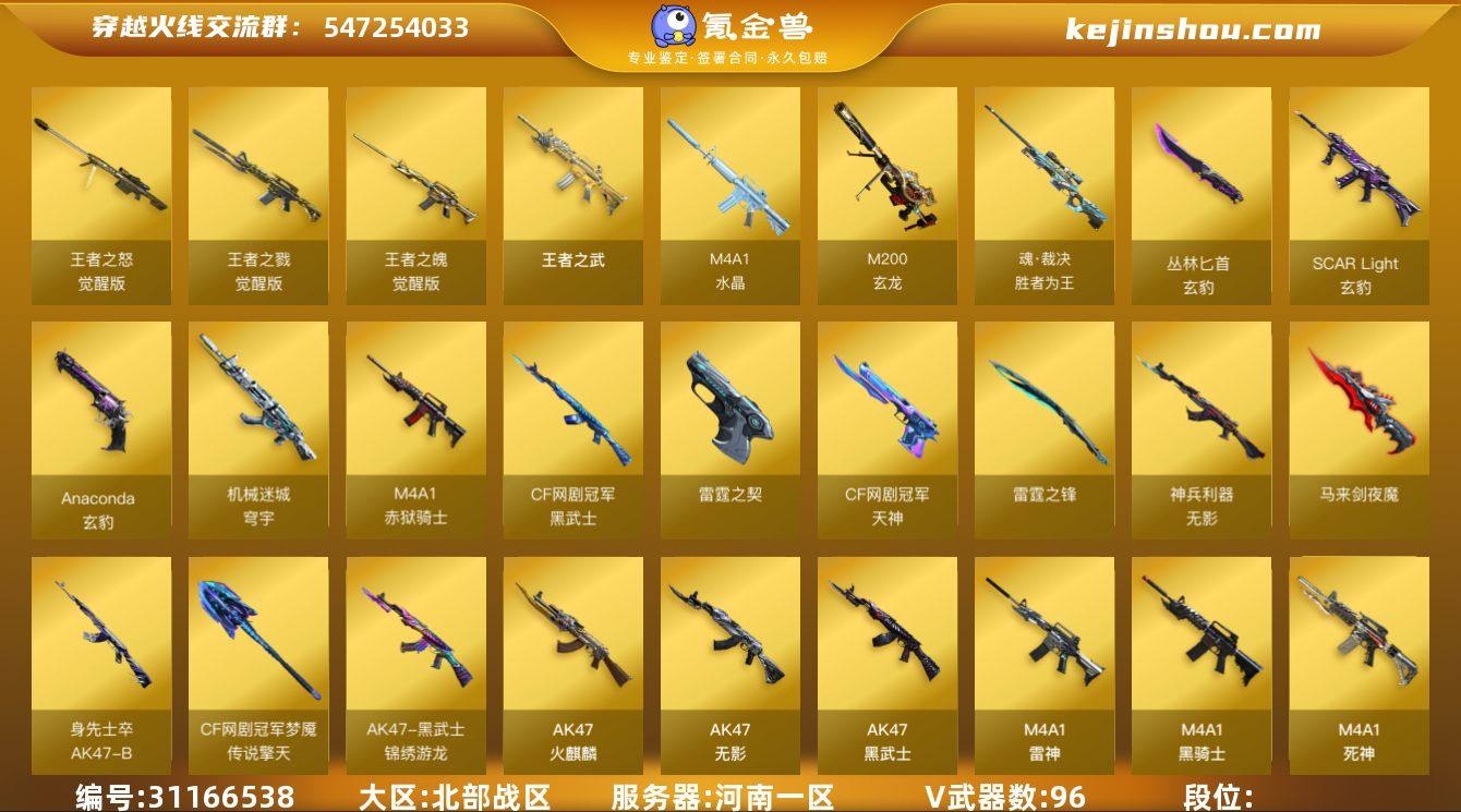 E193346(带4WCF点)cf北部/河南一区/96V/幻神/QBZ金色蔷薇/玄豹套+网剧冠军套/COP雷霆+荣耀世冠柯尔特/炼狱*2/烈龙/盘龙/毁灭三件套+雷神三件套+火麒麟三件套+黑骑士带卡/玄豹(四防)/多皮可排