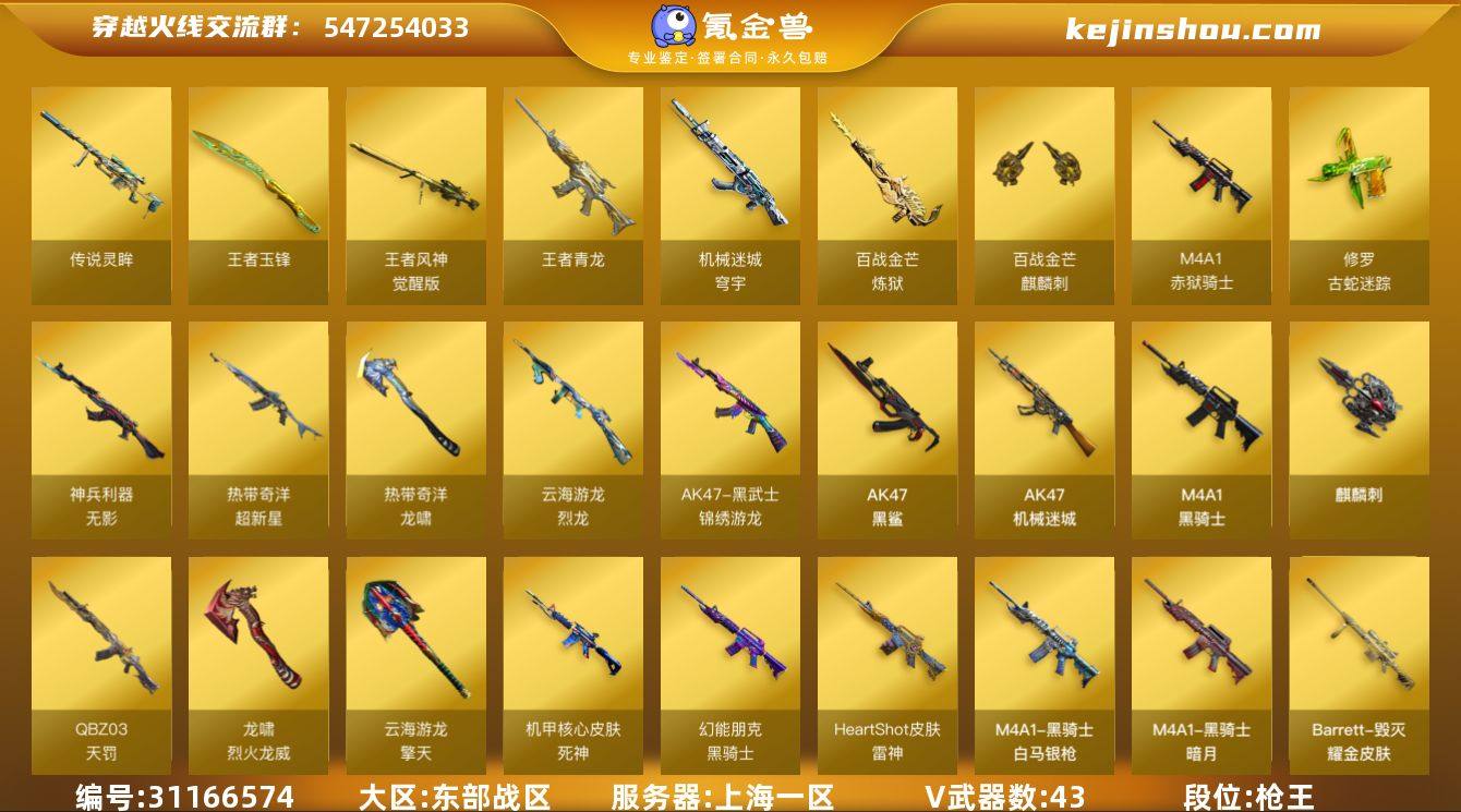 E191326 cf东部/上海一区/43V/传说艾莉莎(四防)/传说灵眸/王者风神/白虎之魄+王者青龙/QBZ天罚/臻选金狐套/黑骑士/毁灭三件套/王者凌霄(四防)/女主播(四防)/9皮可排