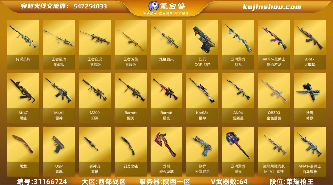 E191491 (传说灵眸+三色幻神+星神三件套+白虎+5四防角色)cf西部/陕西一区/64V/传说灵眸/幻神+宠儿+荣耀世冠白鲨+2022MVP+幻神紫橙光效/星神+枪娘默+星神音效卡+星神紫橙光效/王者白虎/QBZ金色蔷薇+王者芳薇/王者凰鸣/极光+极光音效卡/毁灭/雷神/火麒麟/USP雷暴+COP幻灵+COP白鲨/斯泰尔-蝴蝶/隼(四防)/王者春(四防)/王者凌霄(四防)/王者影豹(四防)/灵狐者职业经理(四防)/14皮可排