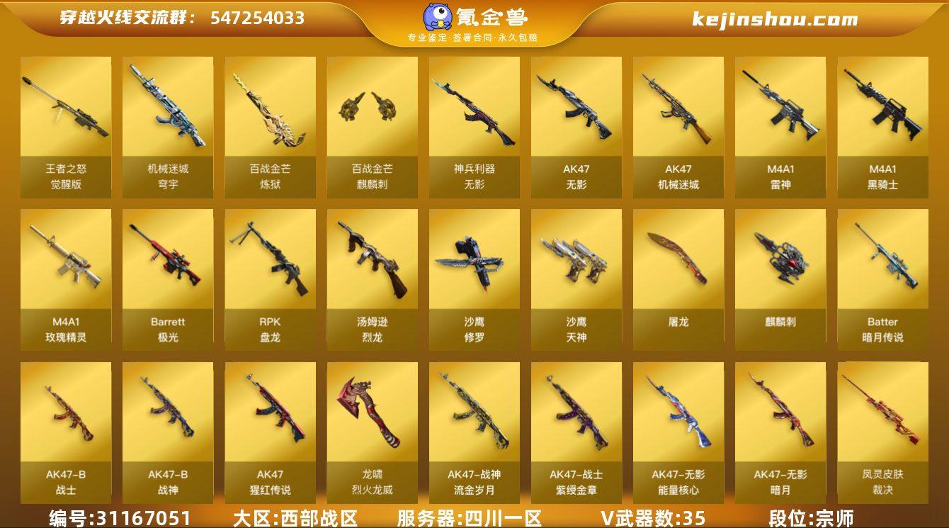湖南一区-23V-3王者-1炫金 【传说武器】:传说灵眸 【热门武器】:传说灵眸,M200-竞技荣光,QBZ03-街机,沙鹰-修罗 【王者炫金武器】:炫金黑龙 【音效卡】:擎天-云海游龙音效卡,M4A1-雷神-云海游龙音效卡 【皮肤】:幻神-丹凤,雷神-宇航兔皮肤,火麒麟-心动糖果,毁灭-黑大圣皮肤,战神-粉色甜心皮肤,AK47-B-常胜将军-曹操 【角色】:王者凌霄,乔伊教练,修道士,云海玲珑,北极狐-X,初恋灵狐,电竞少女,芳心审判者,飞虎队-X,虎妞,嘉年华灵狐,0号玩家,零-水下丽影,灵狐者-X,灵狐者-七夕宝贝,灵狐者-职业经理,龙儿,曼陀罗-X,潘多拉-X,潘多拉-甜心教官,斯沃特-X,蜀雪,兔囡囡,维纳斯 【人偶武器】:AWM-灵狐-15周年嘉年华,迷你裂空之翼,迷你波特博士*2,迷你火种,生化手雷-机甲核心,迷你超能女侍 【暴走生化】:超级对讲机 【挑战大师】:神圣爆裂者III*2,冰龙粉碎者-白马银枪*2,激光毁灭者III-白马银枪*2,VEPR-12-金魔*2,激光毁灭者III,机甲撕裂者III,神圣爆裂者-末日III*2,阐释者III 【英雄级武器】:AK47-火麒麟,M4A1-雷神,无影-神兵利器,黑武士-锦绣游龙,烈火-动感闪耀,王者之城-觉醒版,M200-竞技荣光,烈龙-云海游龙,沙鹰-修罗,天神-动感闪耀,屠龙-动感闪耀,擎天-云海游龙,高爆手雷-幻灵,高爆手雷-竞技荣光,手雷-动感闪耀,手雷-云海游龙,闪光弹-竞技荣光*2,闪光弹-神工天巧,烟雾弹-竞技荣光,烟雾弹-神工天巧 【道具】:BS战队炫彩背包,CFS限定背包,云海游龙炫彩背包,全能枪王背包,女皇终结者-背包,超级背包,女皇终结者-魔龙之吻,绿色巨人,灵魂忍者*2,变异宝贝,迷雾幽灵*2,生化弹匣,夺命之镰,防化服*4,金色流光-枪王排位*2,星辰流光-枪王排位,流光-鎏金之域,枪王排位28赛季金色流光,枪王排位29赛季金色流光,电玩兔兔表情,动感闪耀表...