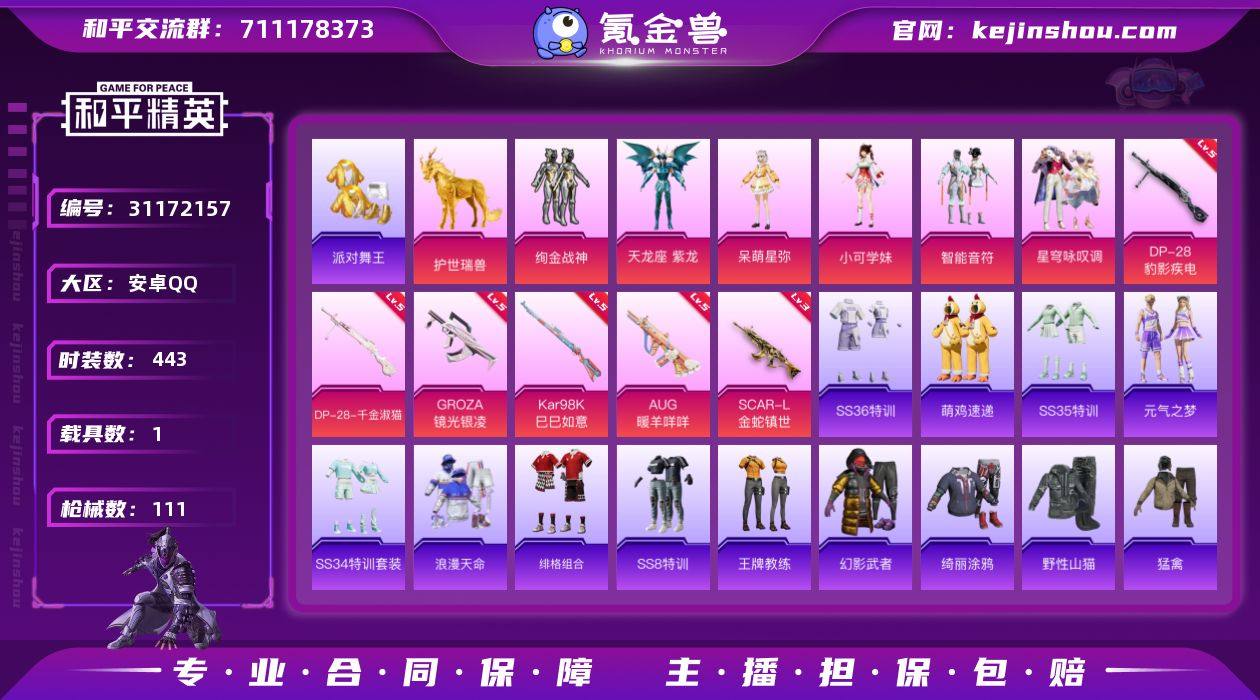热力值:37095 载具数:1 时装数:443 枪械数:111 战备数:99 游戏等级:57 卓越印记:4 传奇印记:2 绝世印记:1 呆萌星弥,天龙座 紫龙,绚金战神,小可学妹,星穹咏叹调,智能音符 五级DP-28-豹影疾电,五级AUG-暖羊咩咩,五级DP-28-千金淑猫,五级GROZA-镜光银凌,五级Kar98K-巳巳如意,三级SCAR-L金蛇镇世 护世瑞兽 极意拳锋降落伞,炫彩糖果降落伞,炫彩糖果飞行器,异瞳寒姬降落伞,古堡领主飞行器,酣梦熊熊飞行器,万象金身飞行器,祥瑞起舞飞行器,白勺歌姬降落伞,幻彩电音降落伞,金蛇镇世降落伞,千金淑猫降落伞,时空协奏降落伞,甜心宝贝降落伞,星穹咏叹调降落伞,戏水时光降落伞 SS36特训,炫彩糖果,萌鸡速递,SS35特训,元气之梦,SS34特训套装,Alan Walker,暗影哥特,缤纷果语,北国孤狼,白糯汤圆,白色伏地魔,霸义无双,长空猛禽,潮萌小黄鸭,大橘大利,都市丽猫,都市魅力,绯格组合,风华少年志,疯狂小兔子,海岛探路者,湖蓝色名流,幻世保卫者,黑色伏地魔,黄色伏地魔,黄色名流,黄色运动,红色运动,幻世战舞者,幻影武者,酒红色名流,橘黑制服,竞技达人朋克,竞技名士,竞技勇士朋克,激萌罗小黑,极速红龙,街头潮人,街头风暴,蓝冰羽,蓝彩潮人,灵公主,猎鹰,镭金极速,浪漫天命,蓝色运动,恋语绒绒,冷焰舞者,摩登魅猫,猛禽,棉花软糖,魅力单车,弄潮海豚,柠萌假日,派对舞王,破蛋小黄鸡,破晓战魂,绮丽涂鸦,青年教官,青团波波,云朵鹅,荣耀,人气偶像,热血青春,深蓝色名流,森林游猎者,SS10特训,SS11特训,SS12特训,SS13特训,SS14特训,SS30特训套装,SS31特训套装,SS32特训套装,SS33特训套装,SS8特训,SS9特训,巳巳如意,特殊使命,糖糖葫芦,特训学院,完美偶像,王牌教练,雪绒豹,旭日情侣,雪山精英,雪鹰学院,星影赞美诗,摇滚战魂,玉兔迎春,野性山猫,鱼渊荷华,燕燕于飞,异域银装,战地督导,智谋强哥,芝莓熊熊,紫幽梦,灼焰舞者 PKM-啾咪啾咪,MK12-乌木金纹,AUG-冰晶雪宝,铝热弹-炫彩糖果,UZI-炫彩糖果,Famas-霓彩脉冲,SVD-霓彩脉冲,破片手榴弹-拽到爆炸,S12K-霓彩脉冲,AKM-涂鸦街区,AC-VAL-天降萌叽,AKM-破晓战魂,AKS-74U-翎光蝶翼,AMR-墨龙九天,AUG-幻影战神,AUG-金蛇镇世,AUG-甜蜜菠萝,AUG-耀粉歌者,DBS-幻彩电音,短管霰弹-星穹咏叹调,大砍刀-云朵鹅,G36C-不夜海上花,Kar98K-红色方程式,Kar98K-星穹咏叹调,M16A4-幻世战舞者,M16A4-千金淑猫,M200-乌木金纹,M24-动感兔斯基,M24-奇异狩猎者,M416-红色方程式,M416-罗小黑,M762-动感兔斯基,M762-牛气冲天,M762-云朵鹅,MG3-幻世战舞者,蜜獾-糖糖葫芦,Mini14-耀粉歌者,Mini14-穿刺龙虾,Mini14-镭金极速,MK12-金蛇镇世,Mk14-紫幽梦,MK20-H-狂鲨锋刃,MK20-H-糖糖葫芦,莫辛纳甘-镭金极速,P18C-糖糖葫芦,P90-金蛇镇世,P90-巳巳如意,P92-紫幽梦,平底锅-不夜海上花,平底锅-糖糖葫芦,平底锅-紫幽梦,PKM-紫幽梦,破片手榴弹-巳巳如意,QBU-不夜海上花,QBZ-神秘黑猫,R1895-镭金极速,S12K-破晓战魂,S12K-夜灯,S1897-紫幽梦,S686-千金淑猫,S686-生命誓言,S686-巳巳如意,SCAR-L-炫彩节奏,SCAR