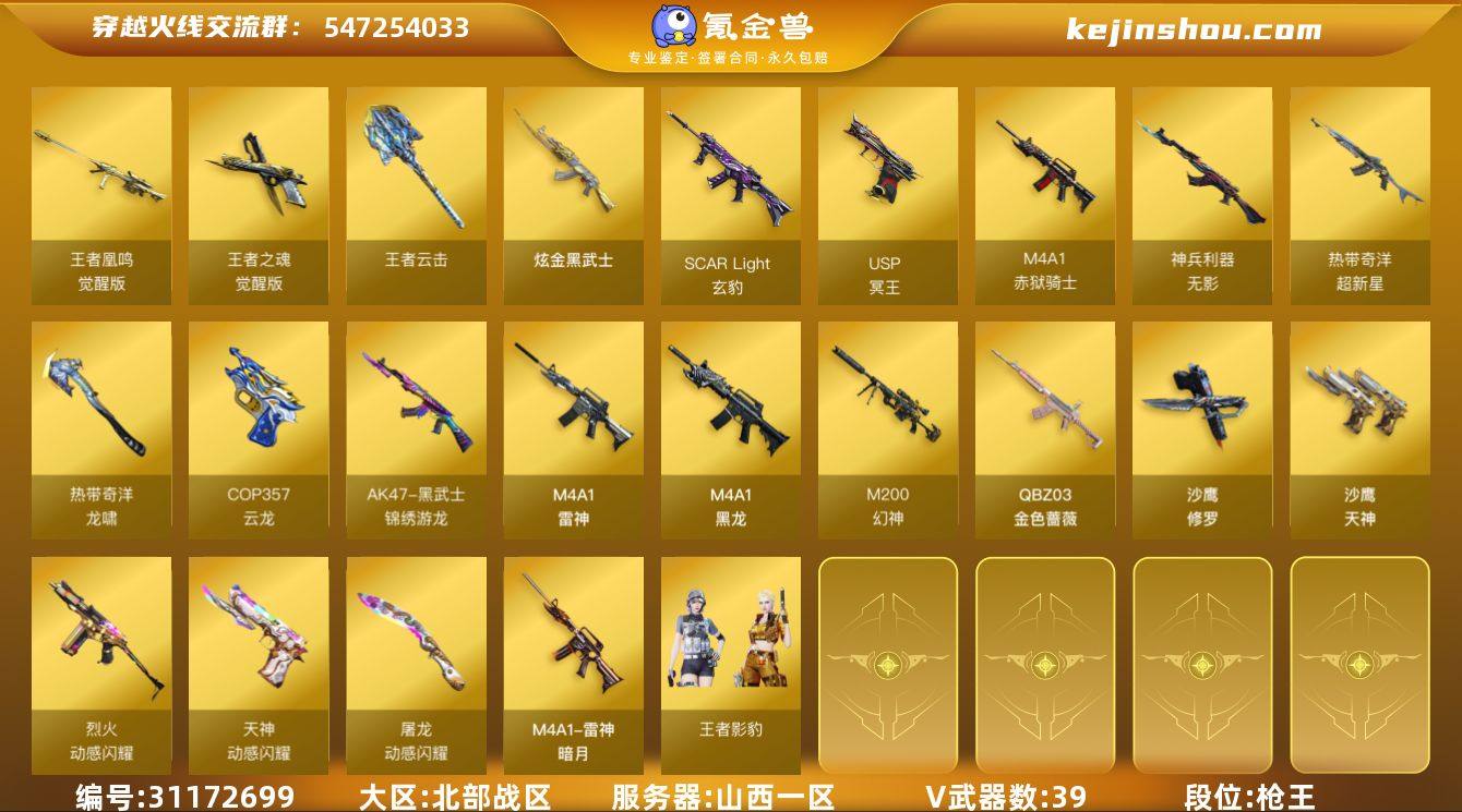 山西一区-39V-3王者-1炫金 【传说角色】:传说星骇 【热门武器】:QBZ03-金色蔷薇,M200-幻神,雷神-小红,沙鹰-修罗 【王者炫金武器】:王者云击,炫金武士 【音效卡】:M4A1-赤狱骑士-怀旧音效卡,Barrett-碧霄极光音效卡 【皮肤】:幻神-青鹤,雷神-暗月 【角色】:王者影豹,雪域霜狐,奇洋探员,乔伊教练,嘉年华灵狐,荆棘玫瑰,灵狐-花神,曼陀罗-礼服,斯沃特-X,游珑儿 【人偶武器】:雷神-小红,AWM-灵狐-15周年嘉年华 【挑战大师】:冰龙粉碎者-白马银枪,激光毁灭者III-白马银枪,神圣爆裂者-末日III 【英雄级武器】:M4A1-黑龙,M4A1-雷神,无影-神兵利器,黑武士-锦绣游龙,超新星-热带奇洋,SCAR Light-玄豹,QBZ03-金色蔷薇,烈火-动感闪耀,M200-幻神,王者凰鸣-觉醒版,沙鹰-修罗,沙鹰-天神,COP 357-云龙*2,USP-冥王,王者之魂-觉醒版,天神-动感闪耀,屠龙-动感闪耀*2,龙啸-热带奇洋,高爆手雷-幻灵*6,手雷-动感闪耀,手雷-热带奇洋,闪光弹-幻灵*7,烟雾弹-幻灵*7,M4A1-赤狱骑士 【道具】:奇洋探员-海龟背包,女皇终结者-背包,热带奇洋炫彩背包,雪域霜狐炫彩背包,女皇终结者-魔龙之吻,救世主-黑桃战神,生化弹匣,夺命之镰,防化服,金色流光-枪王排位*2,星辰流光-枪王排位,枪王排位28赛季金色流光,枪王排位29赛季金色流光,语音特效-怀旧,雪域霜狐表情,热带奇洋表情,动感闪耀表情,防弹头盔*2,防弹衣*2,C4工具钳*2,手雷包*2 【特殊枪械】: