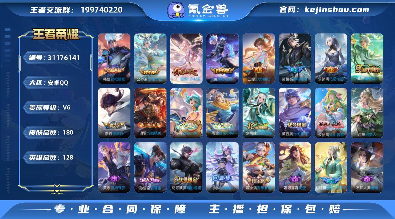 安卓Q-V6-至尊星耀II段位-128英雄-180皮肤-1典藏皮肤-8传说-54史诗LK26224 【英雄全皮】:孙权全皮 【荣耀典藏】:韩信弑枪猎影 【传说皮肤】:公孙离云诺千山,虞姬愿照岁时盈,云缨幻光神枪,桑启鸣野蒿,澜逐花归海,诸葛亮鹤羽星尊,公孙离记忆之芯,李白诗剑行 【限定皮肤】:蔡文姬夏日便利店,大乔绒语心约,姜子牙天穹之誓,李白谪仙醉月,狄仁杰阴阳师,赵云皇家上将,阿轲迷踪丽影,元歌无心,马可波罗暗影游猎,狄仁杰魔术师,项羽海滩派对,孙悟空至尊宝,李元芳云中旅人,雅典娜黎明之约,诸葛亮鹤羽星尊,百里玄策原初追逐者,裴擒虎李小龙,裴擒虎擒涛扼浪,上官婉儿梁祝,鲁班大师探海日志,桑启海盐诗旅,艾琳女武神,阿古朵江河有灵,张良古海寻踪,蒙恬荣光圣徽,鬼谷子天穹祈灯,姬小满妄想食味,沈梦溪龙舞盛年,刘邦剑破天穹,程咬金群星魔术团,周瑜熔金海岸 【年限皮肤】:虞姬愿照岁时盈 【赛季限定】:李元芳云中旅人,桑启海盐诗旅,裴擒虎擒涛扼浪,鲁班大师探海日志,张良古海寻踪,鬼谷子天穹祈灯,刘邦剑破天穹,姜子牙天穹之誓,东皇太一噬灭天穹,太乙真人谧流熔炉,钟馗虚灵犬护,甄姬逆浪荇歌,亚瑟荣光之誓,百里玄策原初追逐者,雅典娜黎明之约,蒙恬荣光圣徽,牛魔星界战将,项羽九幽镇关 【战令限定】:阿轲迷踪丽影,马可波罗暗影游猎,蔡文姬夏日便利店,百里守约百相守梦,老夫子百相守梦,孙膑茶境仙,马超访茗客,莱西奥光弋星穹,明世隐往忆晖光,周瑜线条小狗,小乔线条小狗 【史诗皮肤】:露娜紫霞仙子,阿轲暗夜猫娘,赵云皇家上将,赵云未来纪元,貂蝉圣诞恋歌,甄姬冰雪圆舞曲,王昭君偶像歌手,狄仁杰魔术师,宫本武藏鬼剑武藏,孙尚香水果甜心,妲己魅力维加斯,妲己女仆咖啡,李白千年之狐,吕布末日机甲,孙悟空至尊宝,花木兰水晶猎龙者,小乔缤纷独角兽...