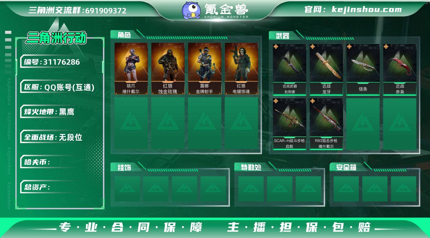 hf12923总资产266m+维什戴尔全套+蚀金玫瑰全套+电锯惊魂红狼全套+赤枭刀+信条刀+龙牙刀+处刑者刀+s7赛季通行证+烽火等级60+特勤部门等级可以+s7巅峰战神+守信不予+永久包赔