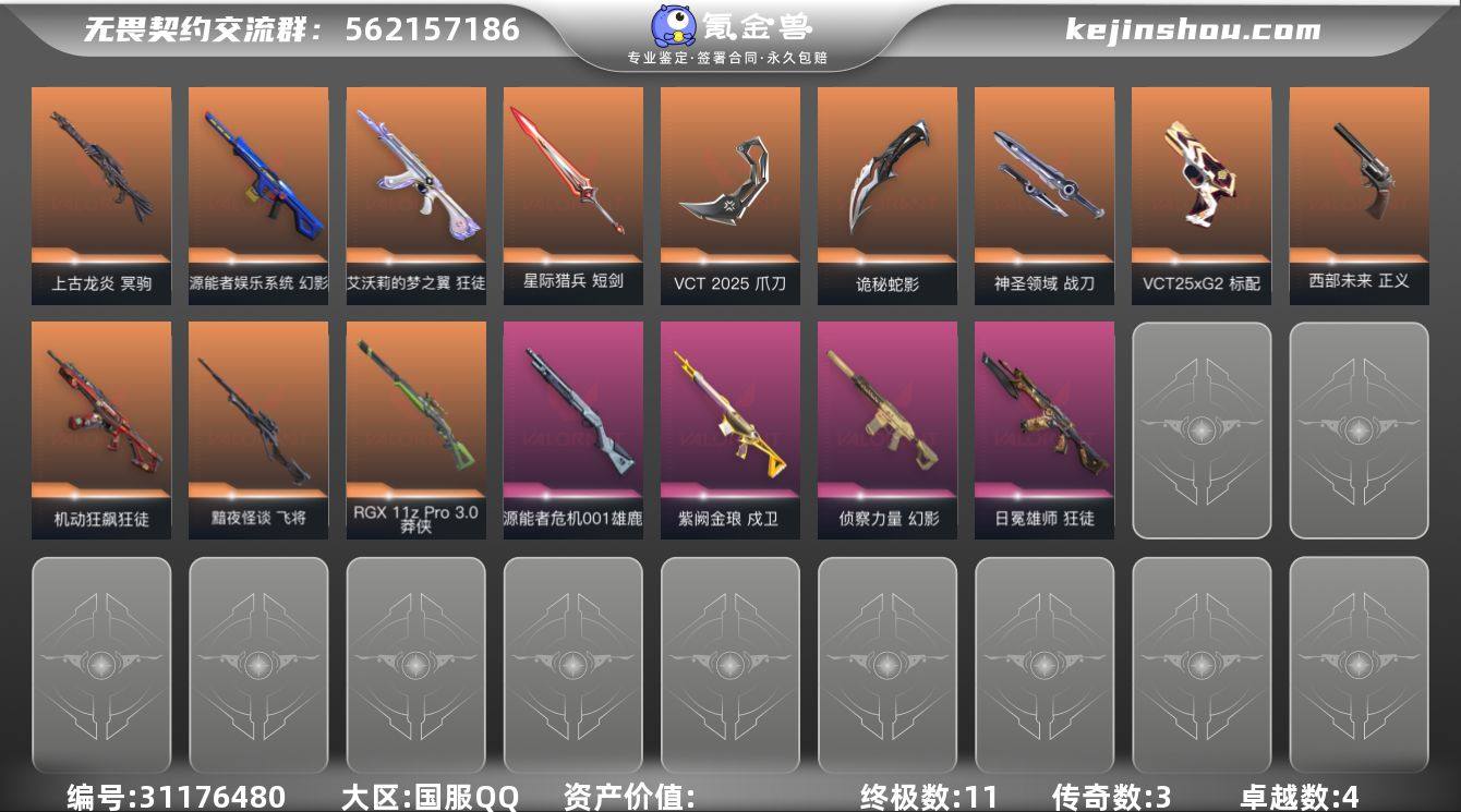 【猫猫AK刀皮很多性价比很高哦】 【套装】:VCT 2025 赛季套装 【英雄】:幻棱,炼狱,维斯,暮蝶,钛狐,壹决,铁臂,捷风,幽影,不死鸟,贤者,猎枭,蝰蛇,零,芮娜,奇乐,尚勃勒,霓虹,斯凯,夜露,星礈,K/O,盖可,黑梦,钢锁 【近战武器】:近战武器-穿花蝴蝶,近战武器-VCT 2025 爪刀,近战武器-金角扇,近战武器-诡秘蛇影 军刀,近战武器-神圣领域 战刀,近战武器-星际猎兵 短剑 【狂徒】:狂徒-艾沃莉的梦之翼,狂徒-机动狂飙,狂徒-日冕雄师,狂徒-诡秘蛇影 【幻影】:幻影-源能者娱乐系统,幻影-侦察力量,幻影-神圣领域,幻影-末日之翼 【戍卫】:戍卫-紫阙金琅,戍卫-月球哨兵,戍卫-折光棱晶 【獠犬】:獠犬-神圣领域 【冥驹】:冥驹-上古龙炎,冥驹-星云暗涌 【飞将】:飞将-黯夜怪谈,飞将-末日之翼 【莽侠】:莽侠-RGX 11z Pro//3.0,莽侠-诡秘蛇影,莽侠-月球哨兵 【战神】:战神-神圣领域 【奥丁】:奥丁-末日之翼 【判官】:判官-诡秘蛇影 【雄鹿】:雄鹿-源能者危机001,雄鹿-月球哨兵 【骇灵】:骇灵-无限竞技,骇灵-星云暗涌 【蜂刺】:蜂刺-星云暗涌,蜂刺-折光棱晶 【标配】:标配-折光棱晶 【VCT手枪】:标配-VCT25 x G2 【正义】:正义-西部未来,正义-月球哨兵 【鬼魅】:鬼魅-诡秘蛇影,鬼魅-星云暗涌 【狂怒】:狂怒-神圣领域 【短炮】:短炮-末日之翼 【卡面】:南瓜盛典 卡面,归乡 // 蝰蛇 卡面,树懒大作战 卡面,Clutch 卡面,无畏契约:尚勃勒 卡面,无畏契约GO!第一卷:芮娜 卡面,无畏契约GO!第一卷:零 卡面,无垠星环 卡面,《双城之战》金克丝 卡面,钢锁vs盖可 卡面,别冒尖 卡面,代号红色 卡面,新兵报到 卡面,V契约 卡面,无畏契约 卡面 【喷漆】:控场勿近 喷漆,致命优雅 喷漆,VCT x G2 喷漆,买装还是存钱 喷漆,红鳞 喷漆,无畏契约GO!第一卷:零 喷漆...